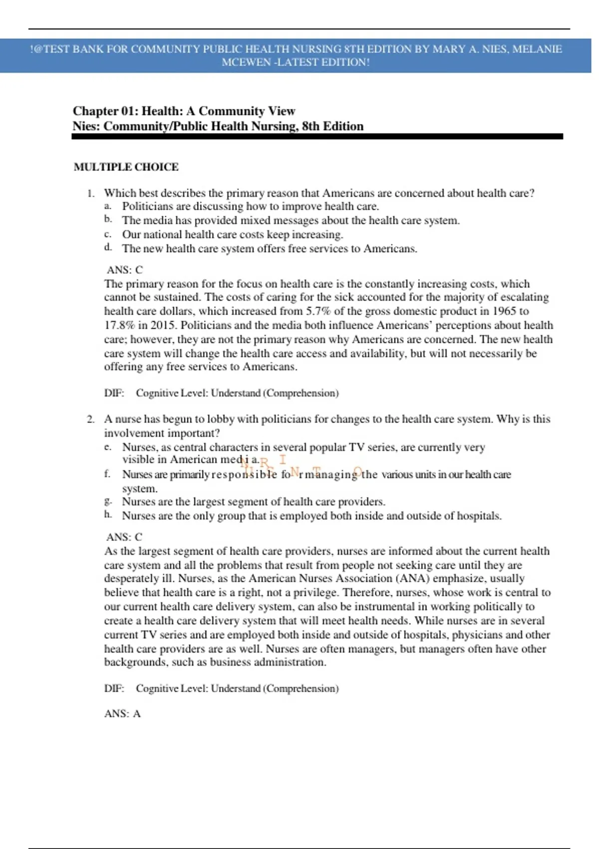 , !@TEST BANK FOR COMMUNITY PUBLIC HEALTH NURSING 8TH EDITION BY MARY A. NIES, MELANIE