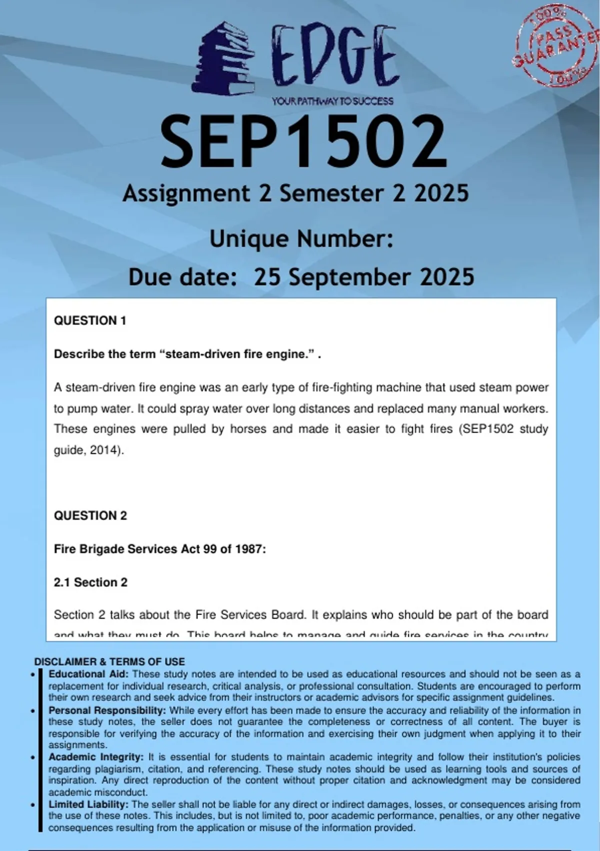 Well-structured SEP1502 Assignment 2 (ANSWERS) Semester 2 2025 - DISTINCTION GUARANTEED. (DETAILED ANSWERS - DISTINCTION GUARANTEED!)..... In your own words, describe about the term “steam-driven fire engine”. [2] QUESTION 2 Every security guard needs to be familiar with the sections of the Fire Brigade Services Act 99 of 1987. Explain Fire Brigade Services Act 99 of 1987 based on the following sections: 2.1 Section 2 [2] 2.2 Section 10 [2] 2.3 Section 9 [2] 2.4 Section 4 [2] [8] QUESTION 3 As a security guard, it is likely that you will be the first person at the scene of arson at your organisation. As the first person, you will have certain responsibilities and procedures to follow. Discuss what your role is as first person to arrive at the arson scene. [8] QUESTION 4 Discuss the responsibilities and duties of an emergency control team. [7] QUESTION 5 Discuss the power of a member of the fire brigade in the line of duty in terms of section 8 of the Fire Brigade Services Act 99 of 1987. [5] SEP1502/2025 3 SECTION B – ESSAY QUESTION QUESTION 6 You are a security officer working at a shopping complex. As part of your responsibilities, you have to undertake regular patrols inside and outside of the complex. While on one of your regular patrols, you discover that a fire has broken out in one of the shops in the shopping centre. You were asked by your supervisor to write and submit a report in the form of an essay regarding the following aspects: 6.1 The actions to take on discovering a fire during a patrol. [4] 6.2 The three (3) important aspects to remember in identifying the correct extinguisher. [3] 6.3 The different classes of fire, a description of each as well as an example by each of the classes. [8] 6.4 Give the step-by-step procedure that must be followed to get water onto the fire using a hose reel. [5]