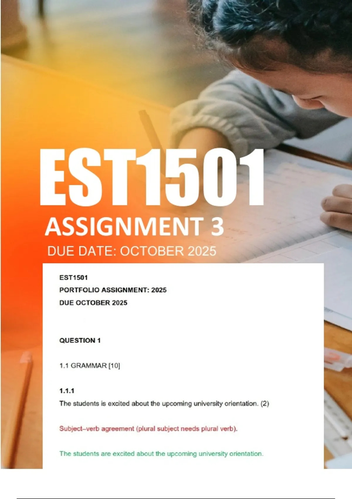 This EST1501 Assignment 3 (2025, due October) is a portfolio-style assignment designed to build core academic literacy skills for higher education. It integrates grammar correction, summary writing, paragraph structuring, multimodal text analysis, and reflective writing on time management. Key aspects include: Grammar Correction: Identifying and fixing common errors such as subject–verb agreement, adverb usage, sentence fragments, and compound sentences. Summary Writing (BELA Bill): Condensing legislative amendments into a topical map and structured summary, showing critical reading and note-making skills. Paragraph Writing: Developing a reflective paragraph on transitioning from high school to university, with a clear topic sentence, thesis statement, supporting details, and examples. Textual Analysis: Examining an advertisement (“Sponsor a Kennel” – SPCA Tshwane) for field, tenor, mode, rhetorical strategies, and semiotic effect. Reflective Essay (Time Management): Discussing how time management understanding evolved through module learning, applying SMART goals, prioritisation, Pomodoro technique, and self-regulation strategies. Evidence of Writing Process: Pre-writing notes, outlines, drafts, and proofreading logs to demonstrate academic writing development.