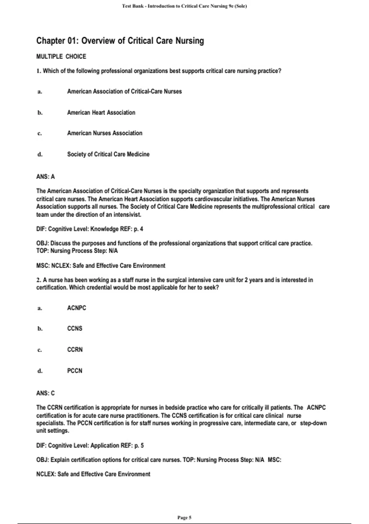 , Test Bank - Introduction to Critical Care Nursing 9e (Sole)