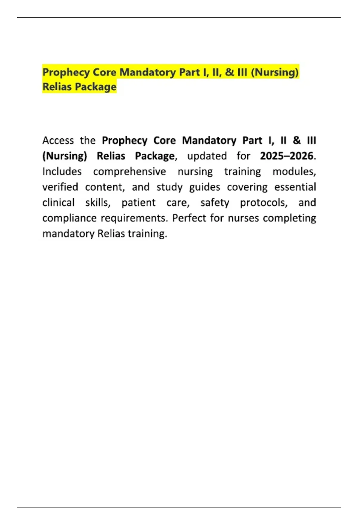Prophecy Core Mandatory Part I, II, & III (Nursing) Package | Complete 2025–2026 Prophecy Nursing Exam Study Bundle with Verified Questions, Correct Answers, and Detailed Rationales – Updated Core Competency Test Bank