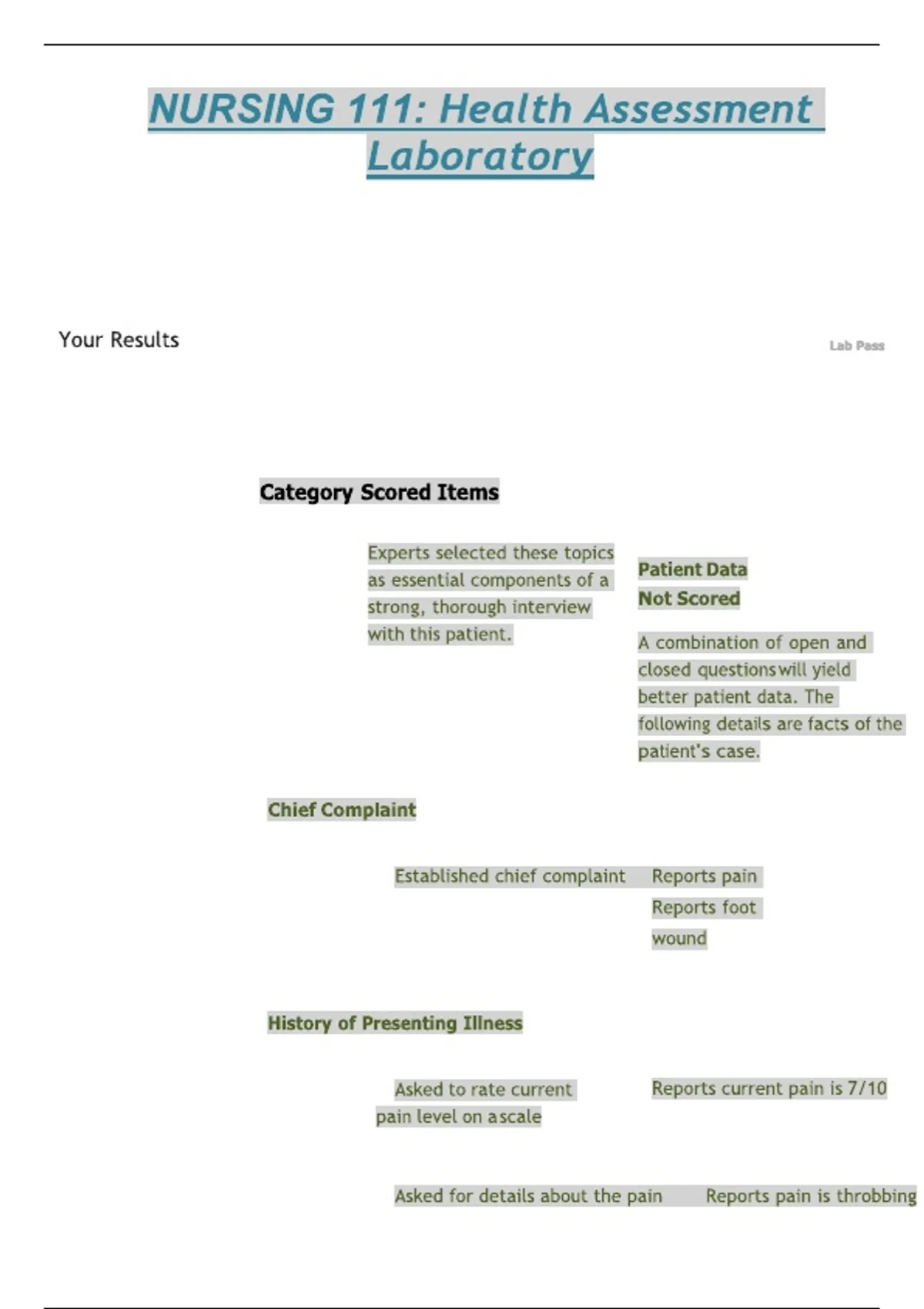 Nursing 111: Health Assessment Laboratory | Complete 2025–2026 Nursing Lab Study Guide with Verified Practice Questions, Correct Answers, and Step-by-Step Health Assessment Procedures – Comprehensive Skills Review