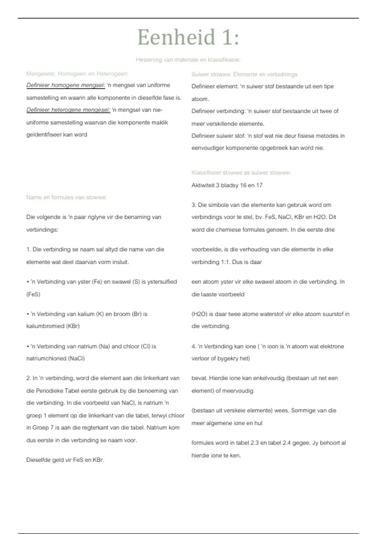 Mengesels: Homogeen en Heterogeen: Suiwer stowwe: Elemente en verbidnings