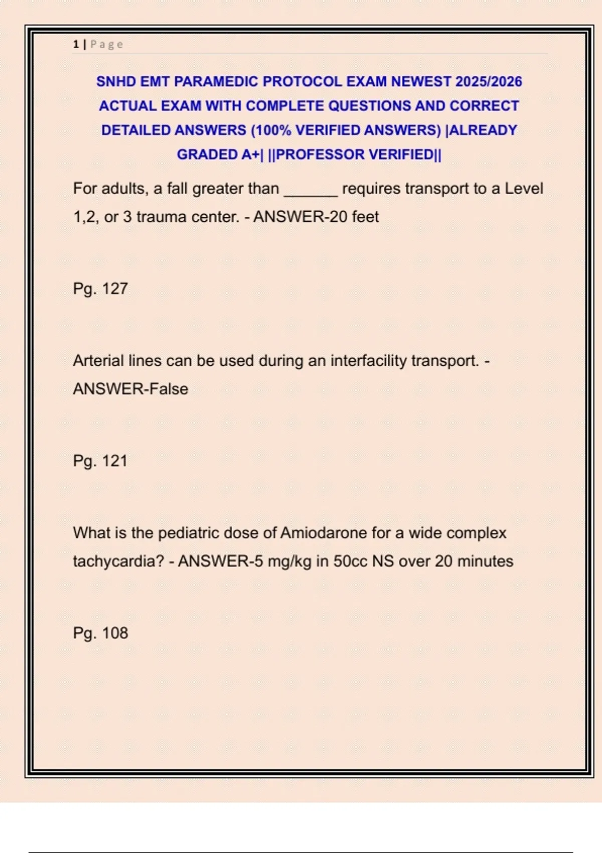 SNHD EMT PARAMEDIC PROTOCOL EXAM NEWEST 2025/2026 ACTUAL EXAM WITH COMPLETE QUESTIONS AND CORRECT DETAILED ANSWERS (100% VERIFIED ANSWERS) |ALREADY GRADED A+| ||PROFESSOR VERIFIED||