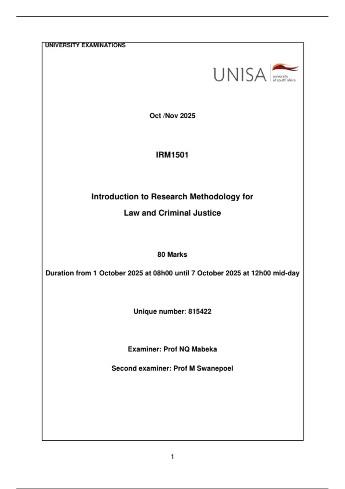 IRM 1501 exam paper and unswer