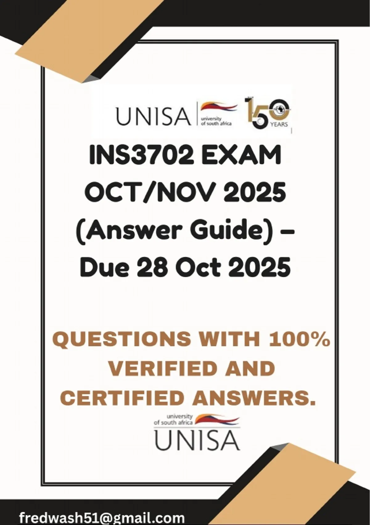 INS3702 EXAM OCT/NOV 2025 (Answer Guide) – Due 28 Oct 2025 VERIFIED AND CERTIFIED ANSWERS. WRITTEN IN REQUIRED FORMAT AND WITHIN GIVEN GUIDELINES. IT IS GOOD TO USE AS A GUIDE AND FOR REFERENCE, NEVER PLAGARIZE. Thank you and success in your academics. UNISA, 2025