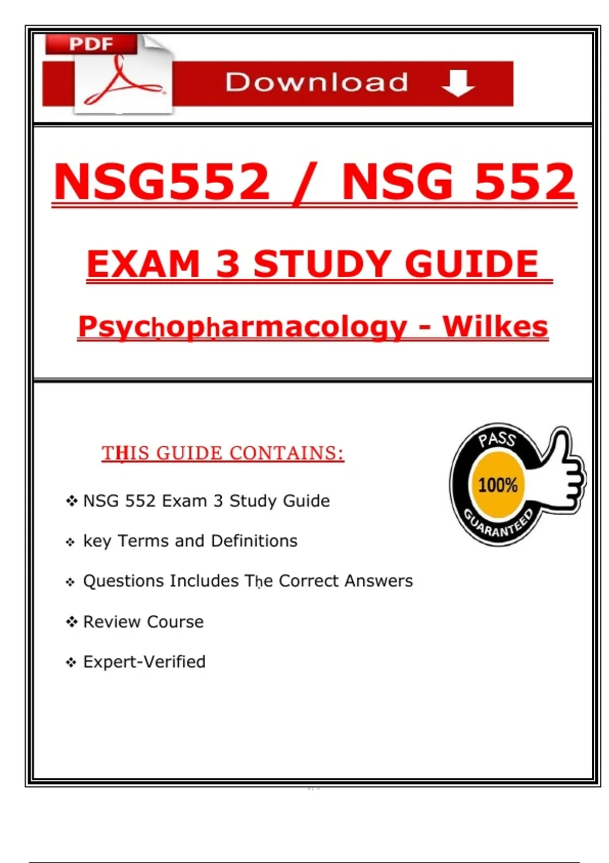 Instant Download PDF – This document is a comprehensive and expert-verified study guide for NSG 552 Exam 3 – Psychopharmacology, part of the Nurse Practitioner program at Wilkes University, updated for the 2025–2026 academic year. It includes clear definitions, drug mechanisms, clinical guidelines, and 60+ high-yield exam questions with correct answers based on up-to-date psychiatric pharmacology protocols. The guide covers essential topics like opioid management (e.g. naloxone, methadone, suboxone), alcohol withdrawal protocols, stimulant use in ADHD, treatment for Alzheimer’s and dementia, nicotine cessation, personality disorders, and autism management. Also includes psychiatric drug side effects, treatment algorithms, and key pharmacologic interventions for conditions like depression, bipolar disorder, psychosis, and substance use disorders. Perfect for NP students preparing for NSG 552 or any advanced psychiatric nursing course focusing on mental health medication management.