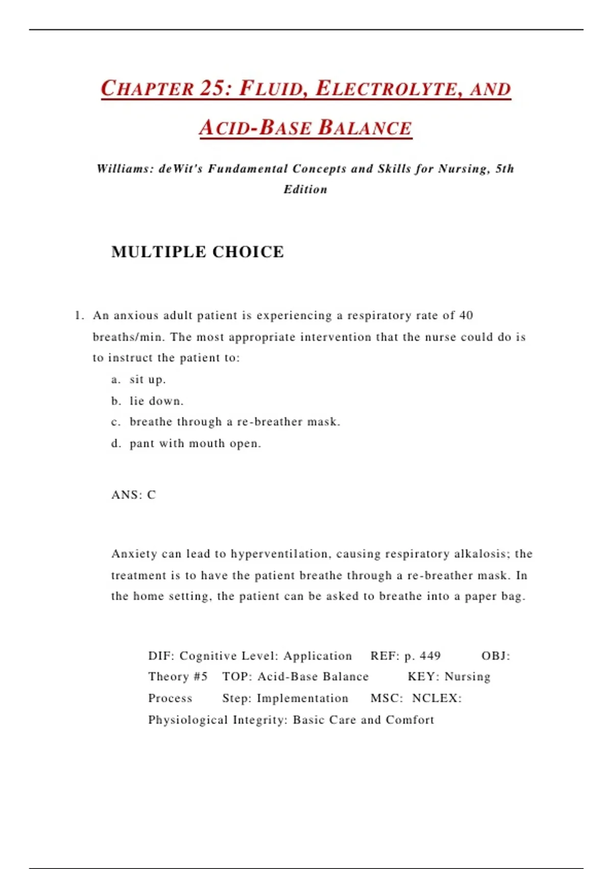 MULTIPLE CHOICE 1. An anxious adult patient is experiencing a respiratory rate of 40 breaths/min. The most appropriate intervention that the nurse could do is to instruct the patient to: a. sit up. b. lie down. c. breathe through a re-breather mask. d. pant with mouth open. ANS: C Anxiety can lead to hyperventilation, causing respiratory alkalosis; the treatment is to have the patient breathe through a re-breather mask. In the home setting, the patient can be asked to breathe into a paper bag. DIF: Cognitive Level: Application REF: p. 449 OBJ: Theory #5 TOP: Acid-Base Balance KEY: Nursing Process Step: Implementation MSC: NCLEX: Physiological Integrity: Basic Care and Comfort 2. The nurse is aware that a more dynamic process that moves molecules into cells regardless of their electrical charge or concentration in the cell is: a. filtration. b. osmosis. c. active transport. d. hydrostatic pressures. ANS: C Active transport can move molecules into cells regardless of their electrical charge or concentration already in the cell. DIF: Cognitive Level: Knowledge REF: p. 440 OBJ: Theory #3 TOP: Active Transport KEY: Nursing Process Step: Planning MSC: NCLEX: Physiological Integrity: Pharmacological and Parenteral Therapies 3. For the accurate measurement to detect fluid retention, the nurse instructs the nursing assistants to measure the weight with the same scale: a. each morning before breakfast after the patient has voided. b. each day at noon before lunch, dressed in light clothing. c. in between meals, dressed in light clothing after voiding. d. just before bedtime, while the patient is in a hospital gown or pajamas.