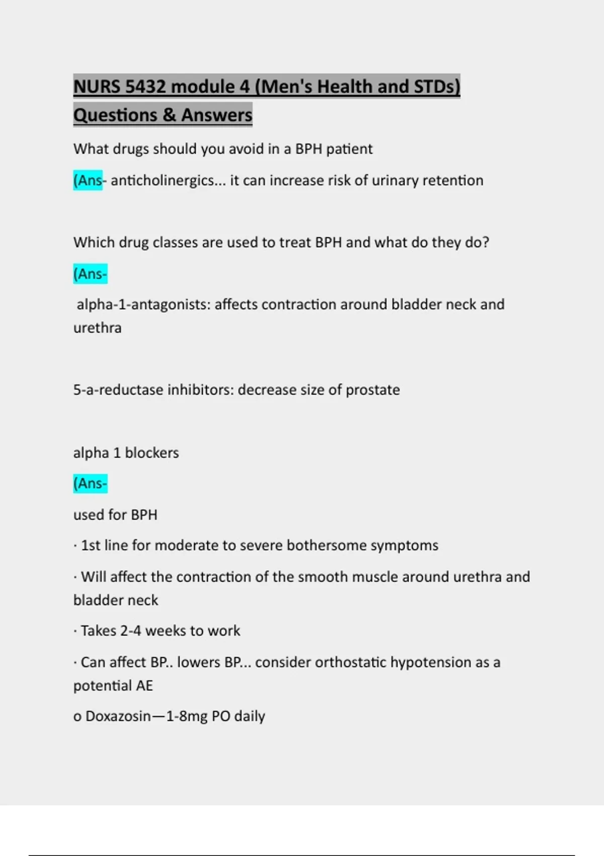 What drugs should you avoid in a BPH patient (Ans- anticholinergics... it can increase risk of urinary retention Which drug classes are used to treat BPH and what do they do? (Ansalpha-1-antagonists: affects contraction around bladder neck and urethra 5-a-reductase inhibitors: decrease size of prostate alpha 1 blockers (Ansused for BPH · 1st line for moderate to severe bothersome symptoms · Will affect the contraction of the smooth muscle around urethra and bladder neck · Takes 2-4 weeks to work · Can affect BP.. lowers BP... consider orthostatic hypotension as a potential AE o Doxazosin—1-8mg PO daily