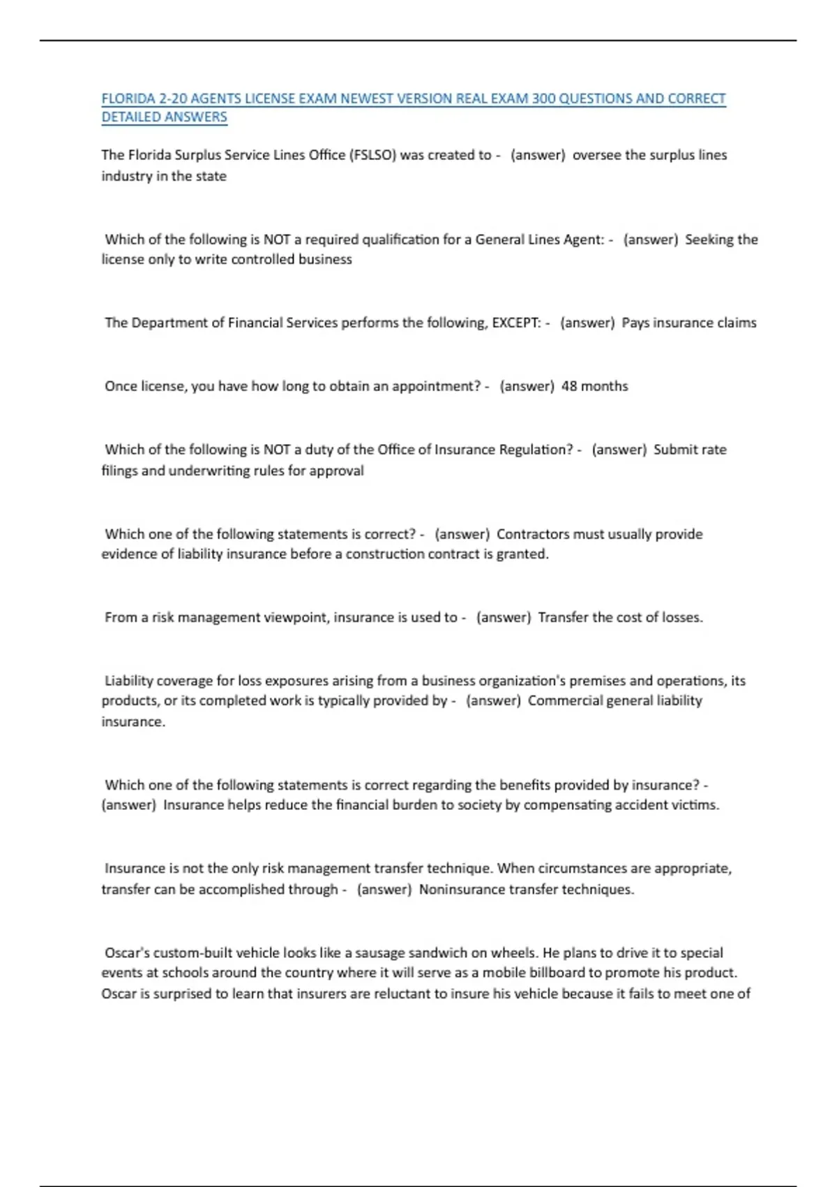 FLORIDA 2-20 AGENTS LICENSE EXAM NEWEST VERSION REAL EXAM 300 QUESTIONS AND CORRECT DETAILED ANSWERS