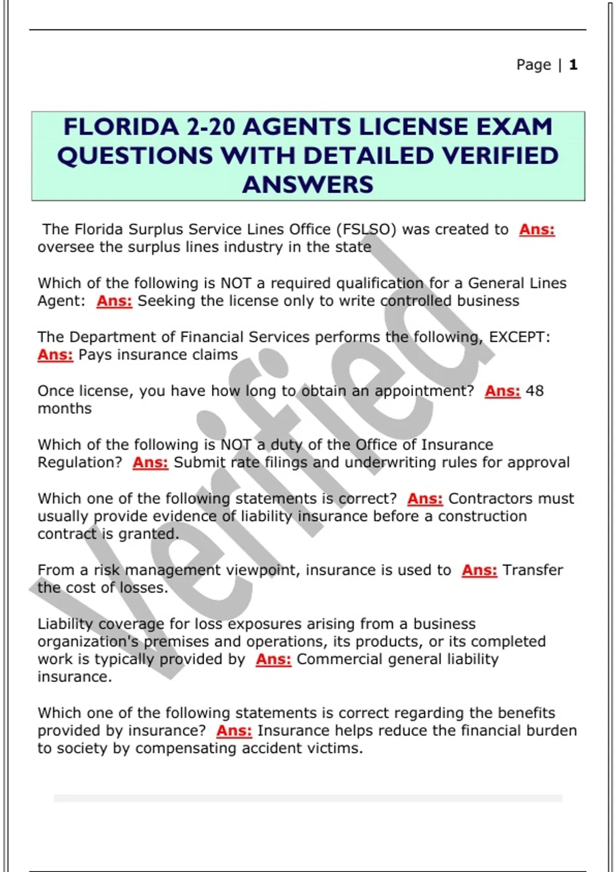 FLORIDA 2-20 AGENTS LICENSE EXAM