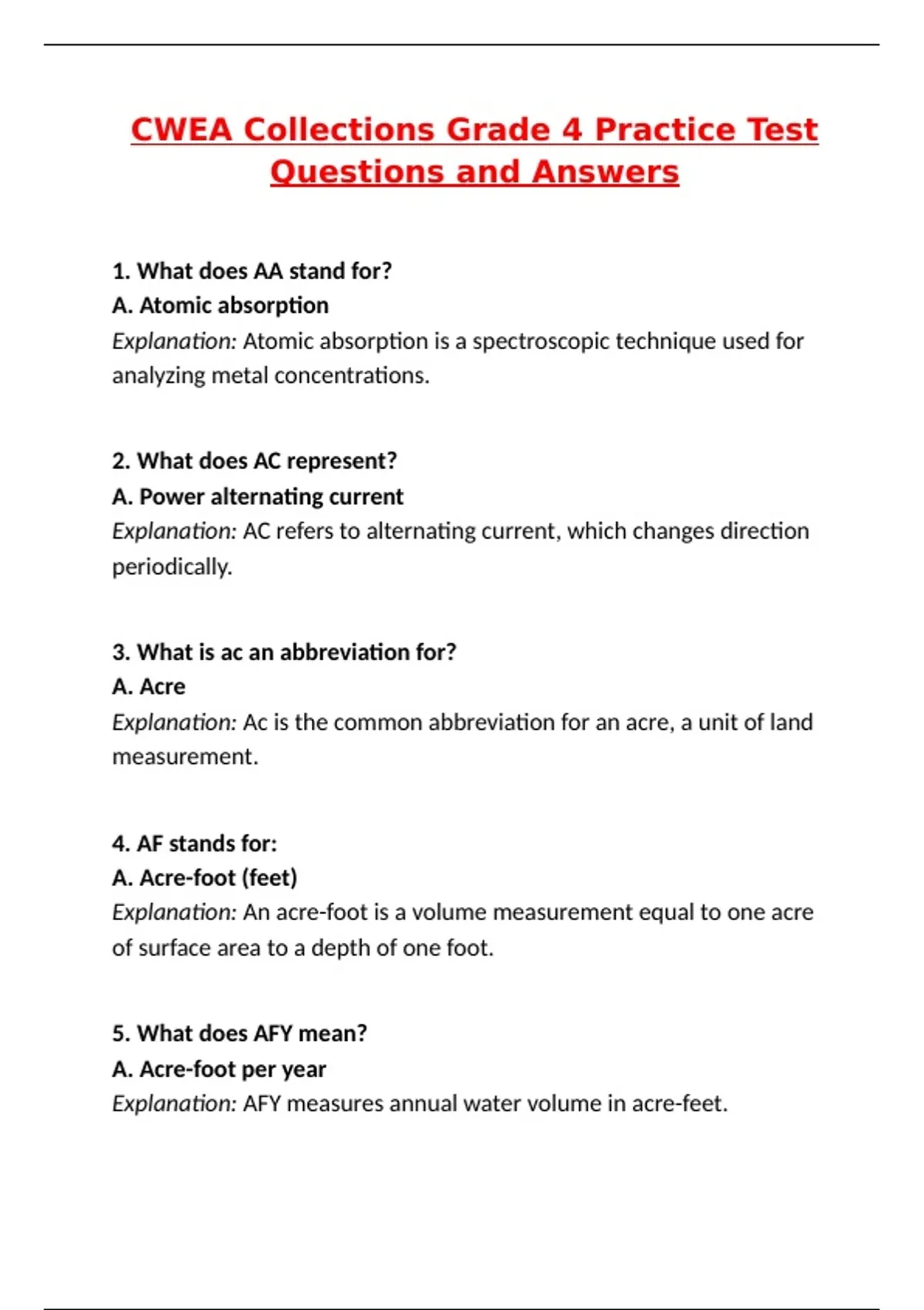 CWEA Collections Grade 4 Practice Test (Latest 2025 / 2026 Update) Questions and Verified Answers | 100% Correct | Grade A+
