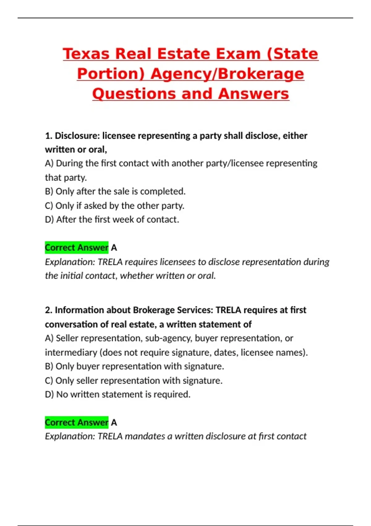 Explanation: TRELA requires licensees to disclose representation during