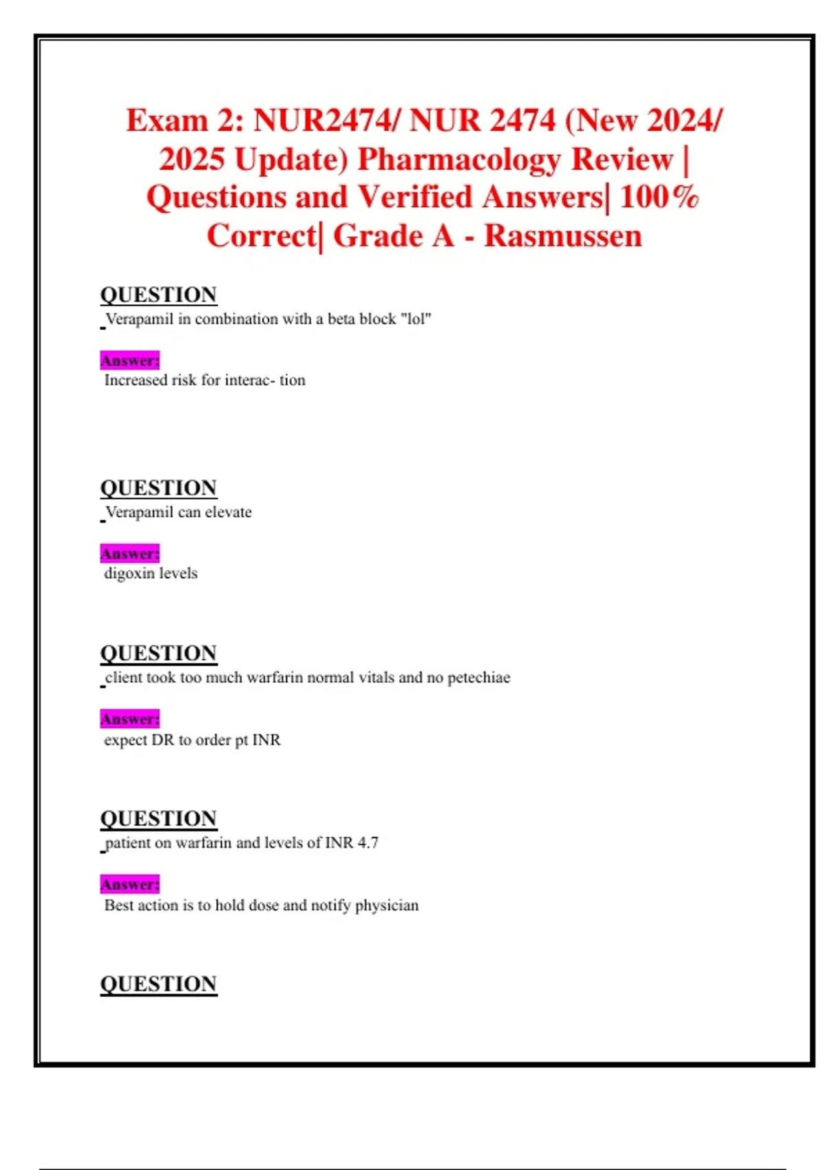 Exam 2 NUR2474 Pharmacology Review | Questions and Verified 100% Correct Answers PDF | Rasmussen 2024–2025 Update