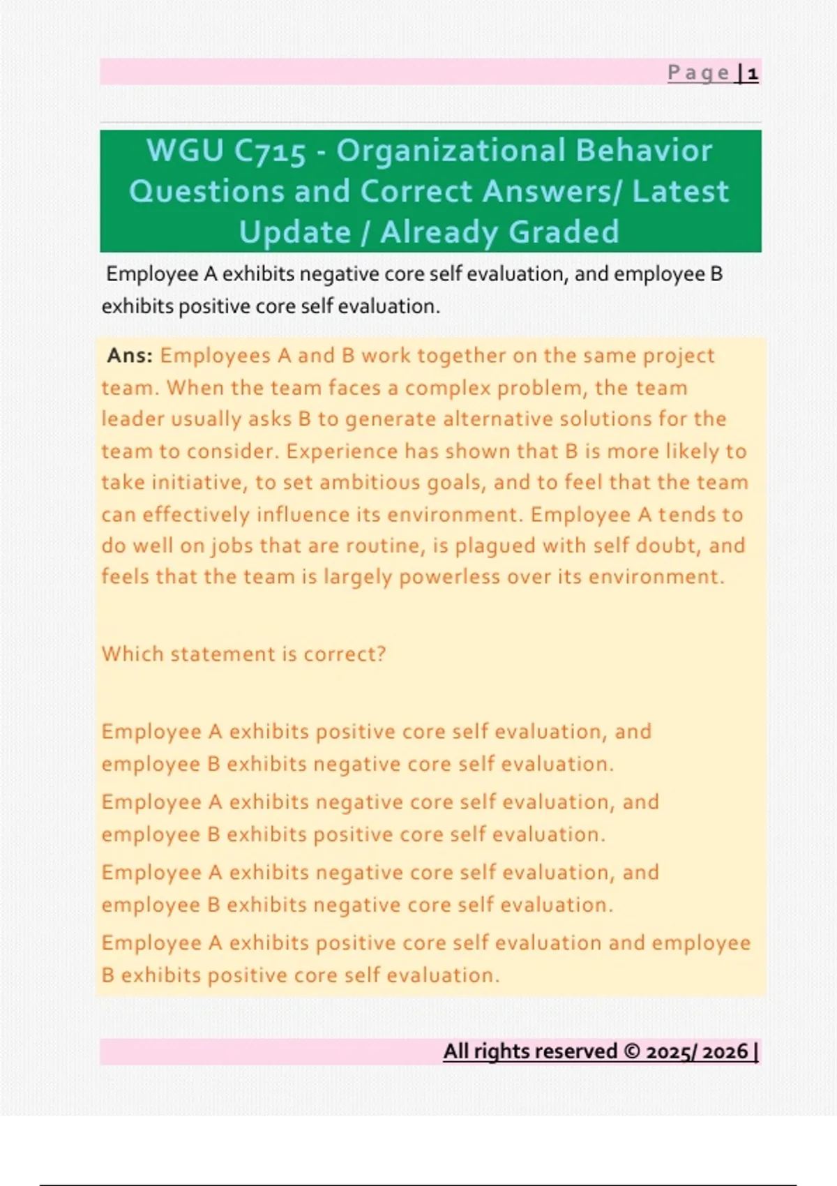 Employee A exhibits negative core self evaluation, and employee B exhibits positive core self evaluation. Ans: Employees A and B work together on the same project team. When the team faces a complex problem, the team leader usually asks B to generate alternative solutions for the team to consider. Experience has shown that B is more likely to take initiative, to set ambitious goals, and to feel that the team can effectively influence its environment. Employee A tends to do well on jobs that are routine, is plagued with self doubt, and feels that the team is largely powerless over its environment. Which statement is correct? Employee A exhibits positive core self evaluation, and employee B exhibits negative core self evaluation. Employee A exhibits negative core self evaluation, and employee B exhibits positive core self evaluation. Employee A exhibits negative core self evaluation, and employee B exhibits negative core self evaluation. Employee A exhibits positive core self evaluation and employee B exhibits positive core self evaluation. Page | 2 All rights reserved © 2025/ 2026 | Situation, target, and perceiver Ans: Employee B was upset by Employee A's behavior at the department's planning meeting. Which factors will influence Employee B's perception in this situation? Choose 1 answer Stimulation, task, and skills Situation, target, and perceiver Problem, criteria, and alternatives Heredity, environment, and perceiver Instrumental values Ans: A person is broadminded, courageous, and forgiving. Which type of values are these? Choose 1 answer Page | 3 All rights reserved © 2025/ 2026 | Terminal values Transitory values Determinate values Instrumental values Intrinsic reward Ans: An employee enjoys having a large span of responsibility and is motivated to do well because of personal feelings. Which kind of reward is this? Choose 1 answer Intrinsic reward Extrinsic reward Affiliation reward Compensatory reward Maslow's Hierarchy of Needs Theory Ans: Which theory of motivation focuses on 5 levels of needs, and further separates those needs by lower-order needs and higher-order needs? Page | 4 All rights reserved © 2025/ 2026 | Choose 1 answer McGregor's Theory X and Theory Y McClelland's Theory of Needs Maslow's Hier