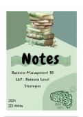 These notes provide a detailed look at learning unit 1 of Business Management 3B (2nd semester). They include customized diagrams, images, and explain business level strategies such as low-cost leadership, differentiation, focused strategies and more. A table of definitions is included at the end of the notes as well. Notes are based on modules taken at Varsity College and are aimed to help students, especially online students, to minimize their time spent on the textbook and focus on the need t...