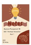 These notes provide a better understanding of basic concepts such as value innovation and more, as well as provide a better understanding of the theories of innovation as well as value innovation. Nicely structured with summary tables and learning outcomes to assist with knowing what is expected if you to answer exam questions.