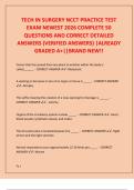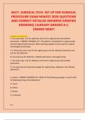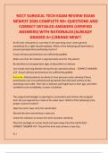 This document contains a complete NCCT Surgical Technologist (TS-C) review exam for 2026 with 220 newest exam-style questions and verified, detailed correct answers. The questions comprehensively cover perioperative procedures, instrumentation, patient positioning, sterile technique, surgical emergencies, sterilization methods, sutures, drains, anesthesia considerations, infection control, laser safety, orthopedic and general surgery concepts.