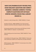 This document contains the NURS 5334 Pharmacology Review Final Exam for the 2026–2027 academic year, including two full exam versions with complete questions and detailed, verified correct answers. It covers key pharmacology concepts tested in advanced nursing programs, such as drug classifications, mechanisms of action, adverse effects, contraindications, patient safety, dosage considerations, and clinical decision-making.
