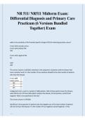 Comprehensive test bank for NR 511 Midterm Exam and Differential Diagnosis Primary Care Practicum (6 Versions). Includes verified questions and answers covering advanced health assessment, differential diagnosis, patient management, clinical decision-making, and exam-focused content for nurse practitioner students.