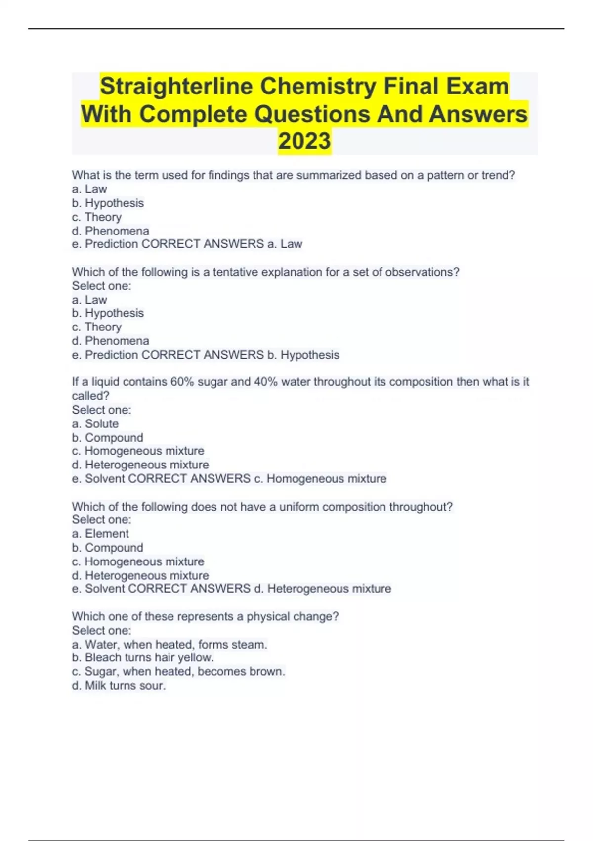 Straighterline Chemistry Final Exam With Complete Questions And Answers 2023 Straighterline CHEM101 Final Exam Test Completely Answered Chem Final (Straighterline) [C] Exam Solved 100% Correct!!