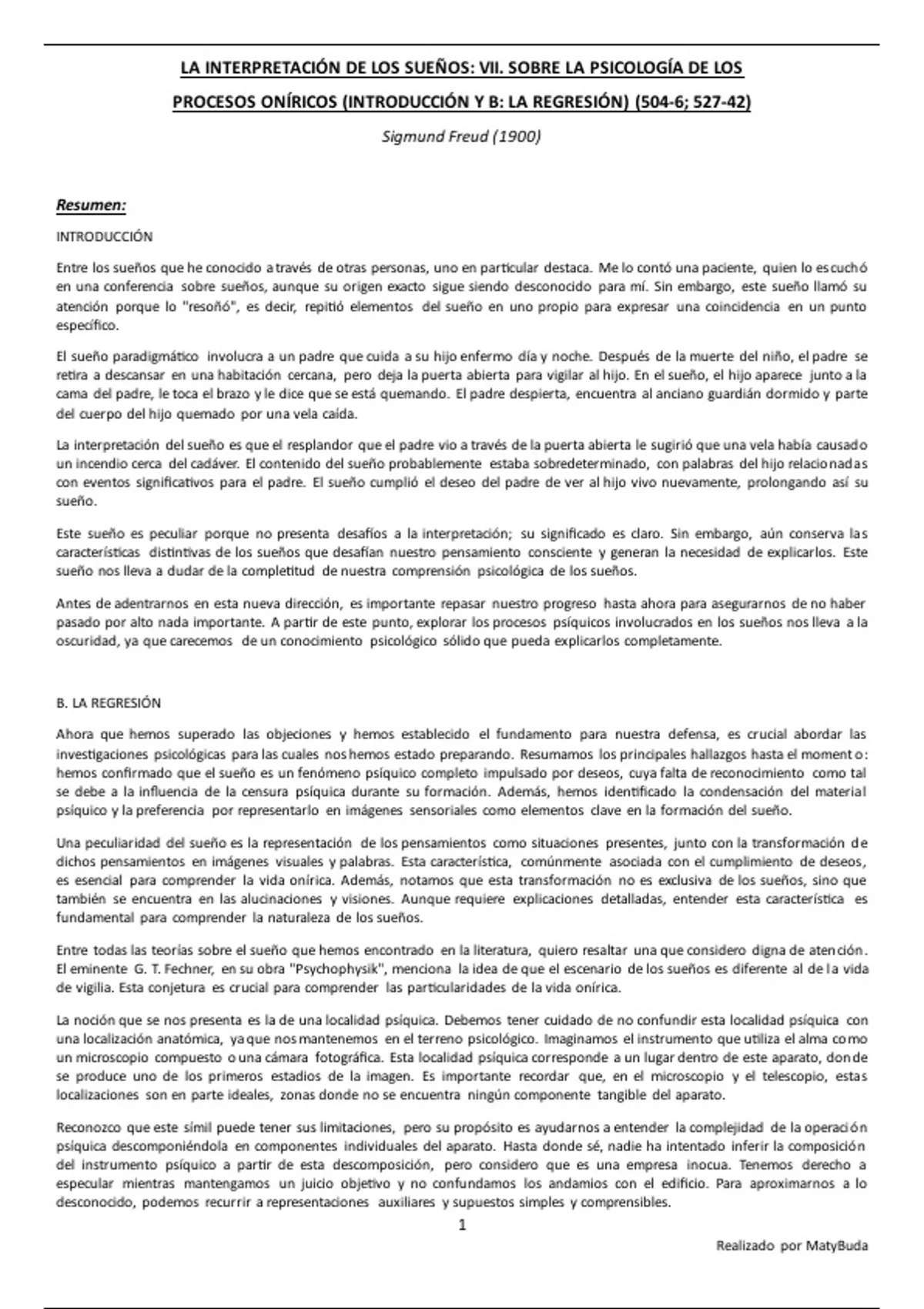 Resúmenes de los textos: 'La Interpretación de los Sueños. VII. Sobre la Psicología de los Procesos Oníricos (Introducción y B. La Regresión)' de Freud; y 'Carta 52' de Freud.