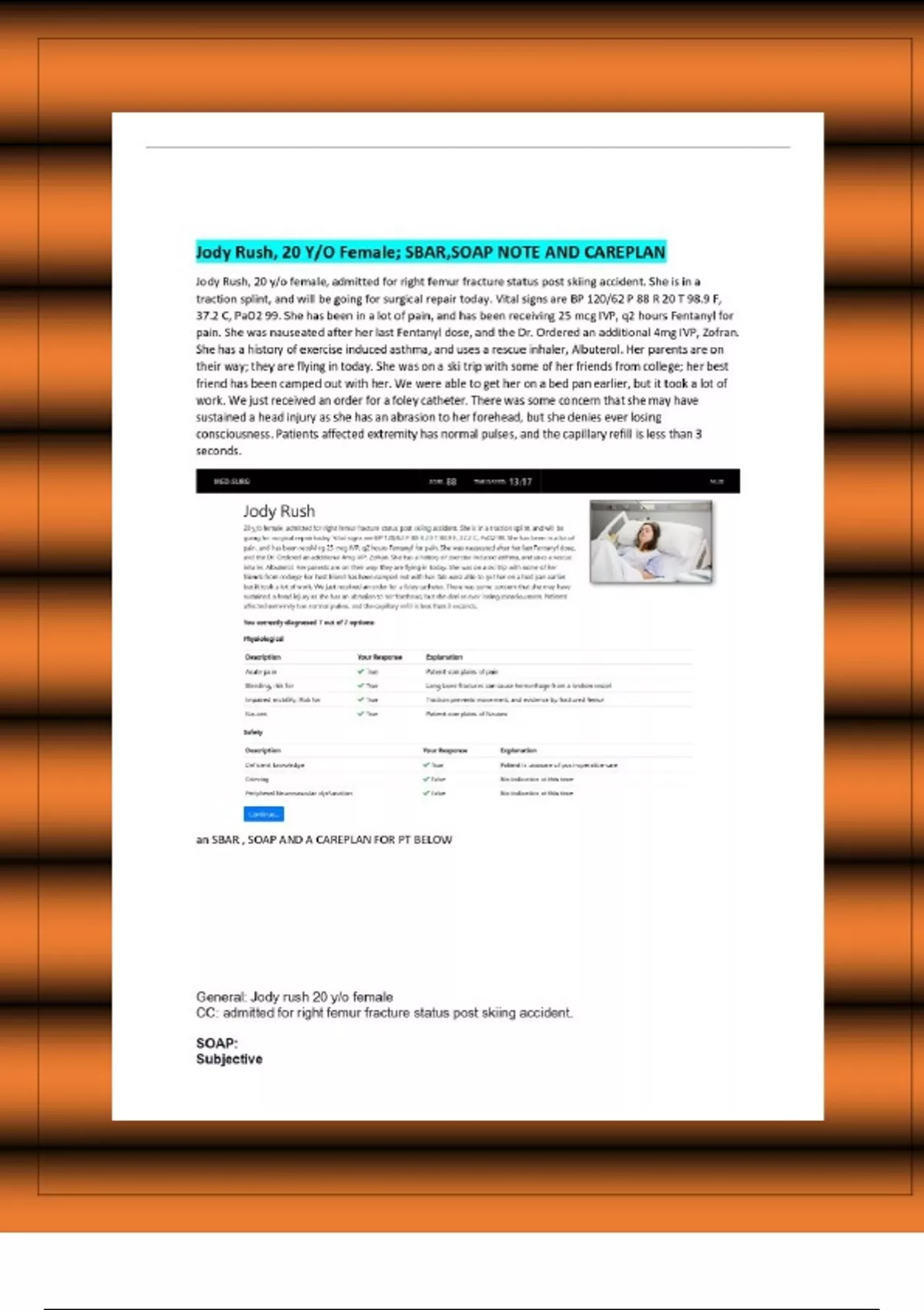 SBAR, SOAP Note, and Care Plan for Jody Rush (20 y/o, Right Femur Fracture Post-Skiing Accident)