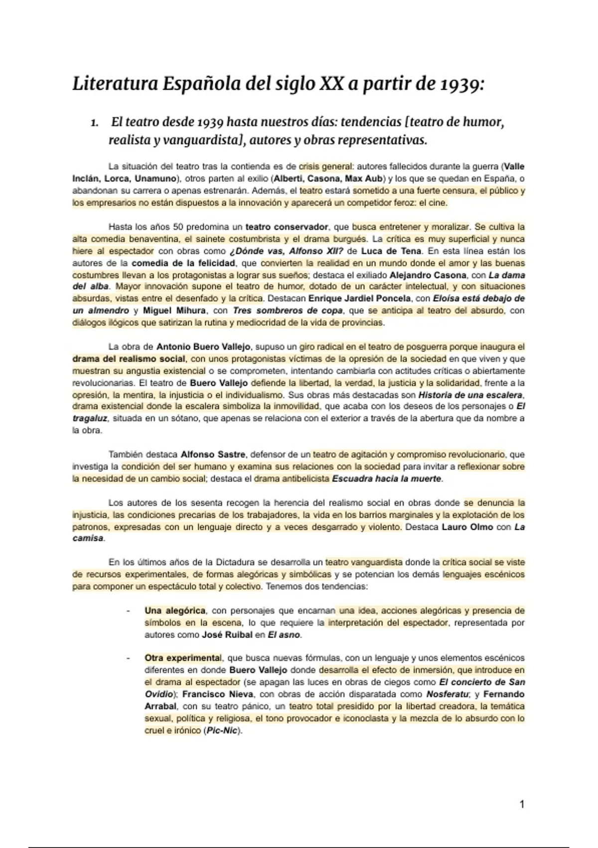 Este paquete contiene toda la literatura que se ve en segundo de bachillerato orientado a selectividad. Son dos documentos, el primero detalla la literatura del siglo XX antes de 1939 y el segundo abarca hasta finales de siglo. Incluye la novela, la poesía y el teatro y explica las características de cada corriente y autor, así como sus obras