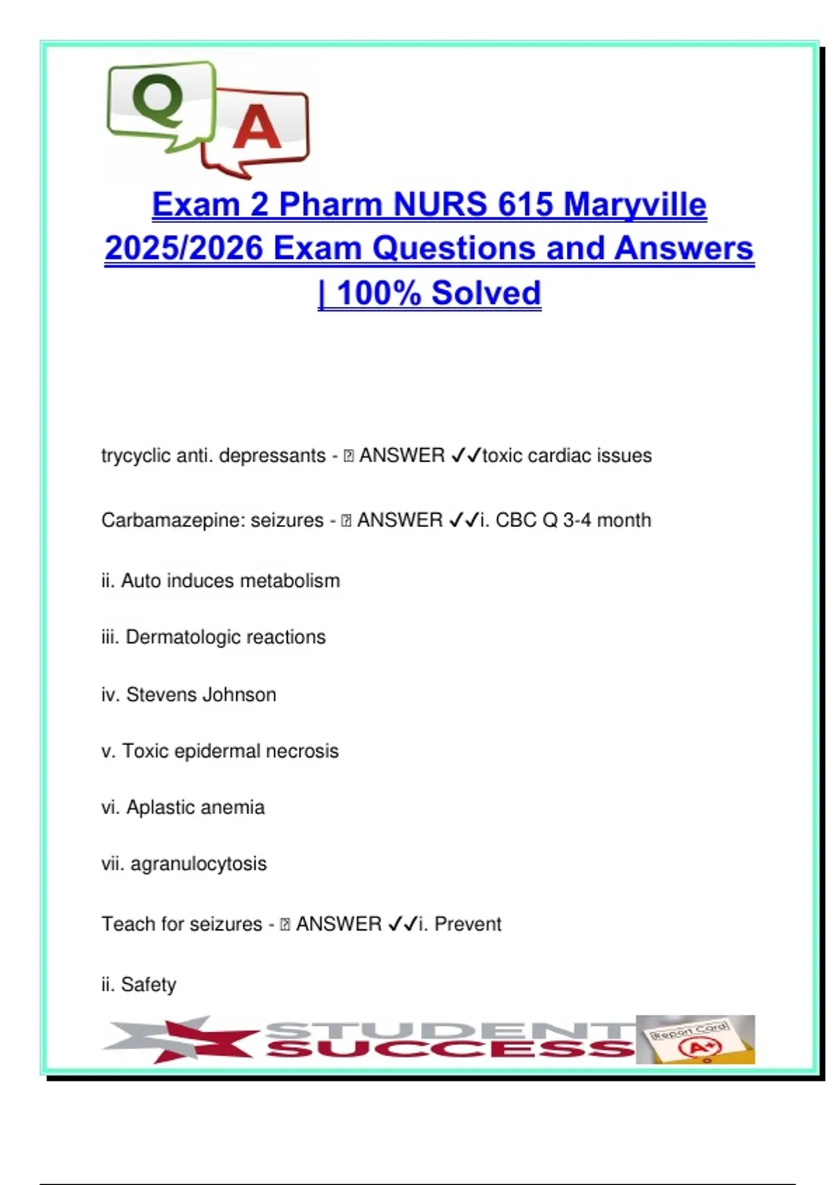 NURS 615 Pharmacology – 2025/2026 Exam 2 – 200+ Verified Q&As on Anticonvulsants, Antidepressants, Antibiotics – Maryville University