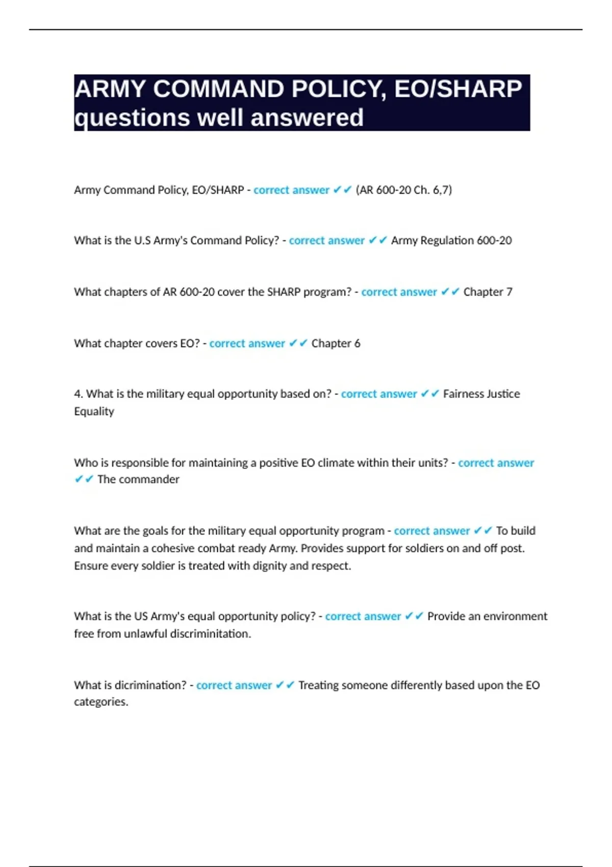 1 Exam (elaborations) EO SHARP (AR 600-20) questions well answered 2 Exam (elaborations) Board Questions; EO SHARP questions with answers 3 Exam (elaborations) AR 600-52 (SHARP EO) questions with correct answers 4 Exam (elaborations) ARMY SHARP & EO Program; Promotion Board fully solved