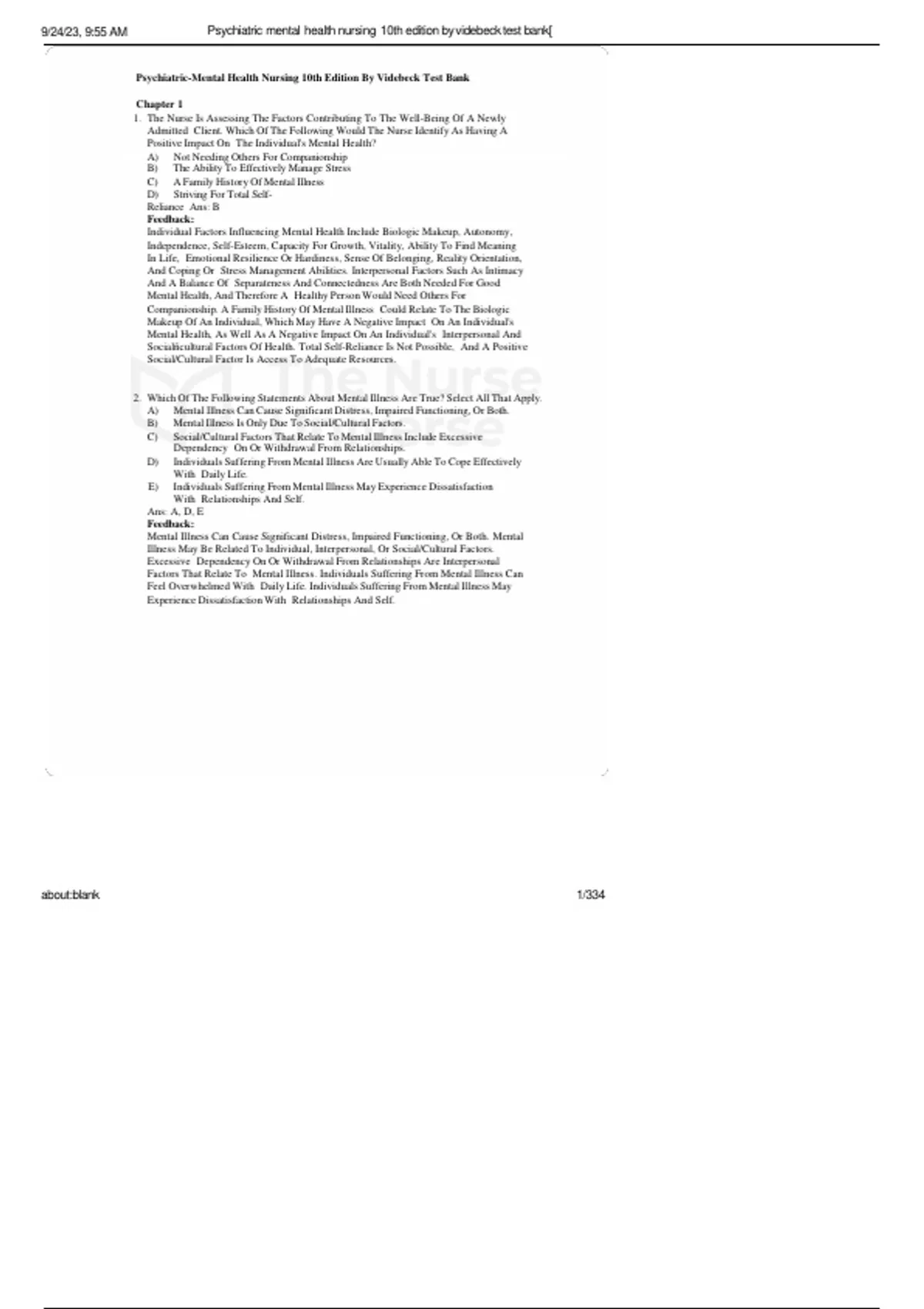 , 9/24/23, 9:55 AM Psychiatric mental health nursing 10th edition by videbeck test bank[