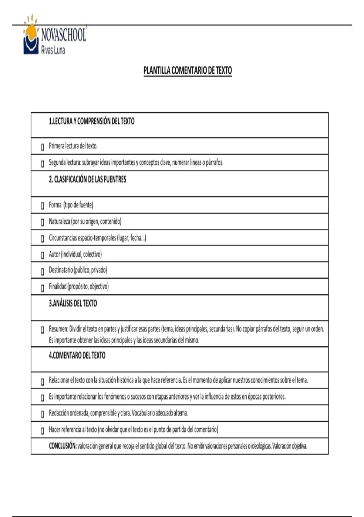 CONCLUSIÓN: valoración general que recoja el sentido global del texto. No emitir valoraciones personales o ideológicas. Valoración objetiva.