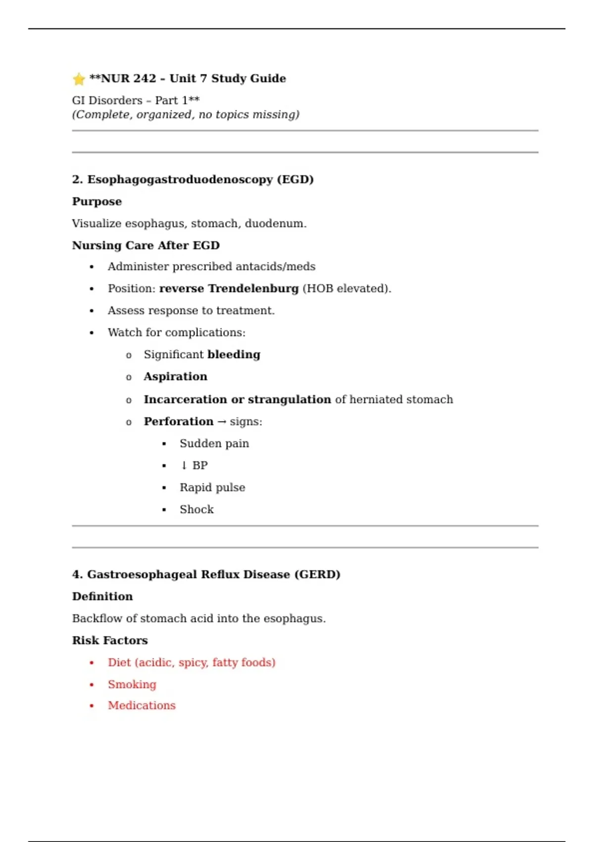 NUR 242 med surg exam 3 Unit 7 Study Guide GI disorders part 1 FALL 2025 Galen college