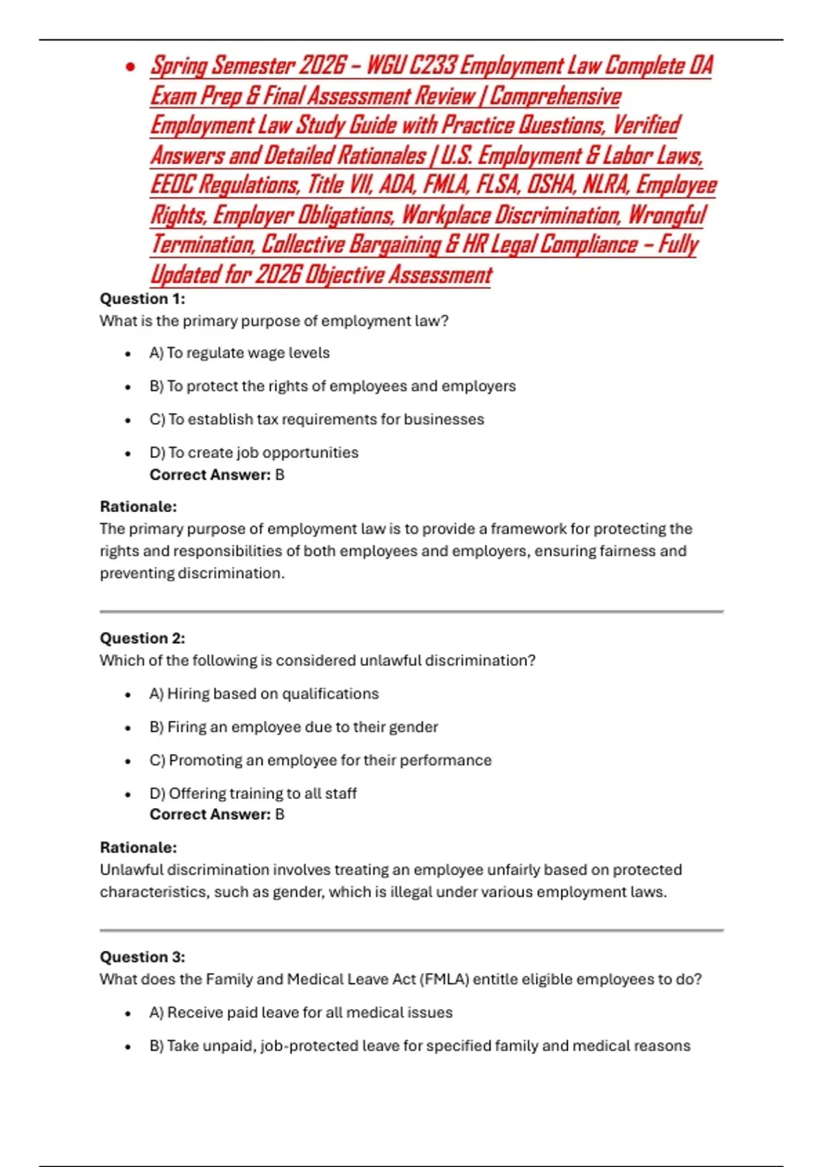 Employment Law Study Guide with Practice Questions, Verified