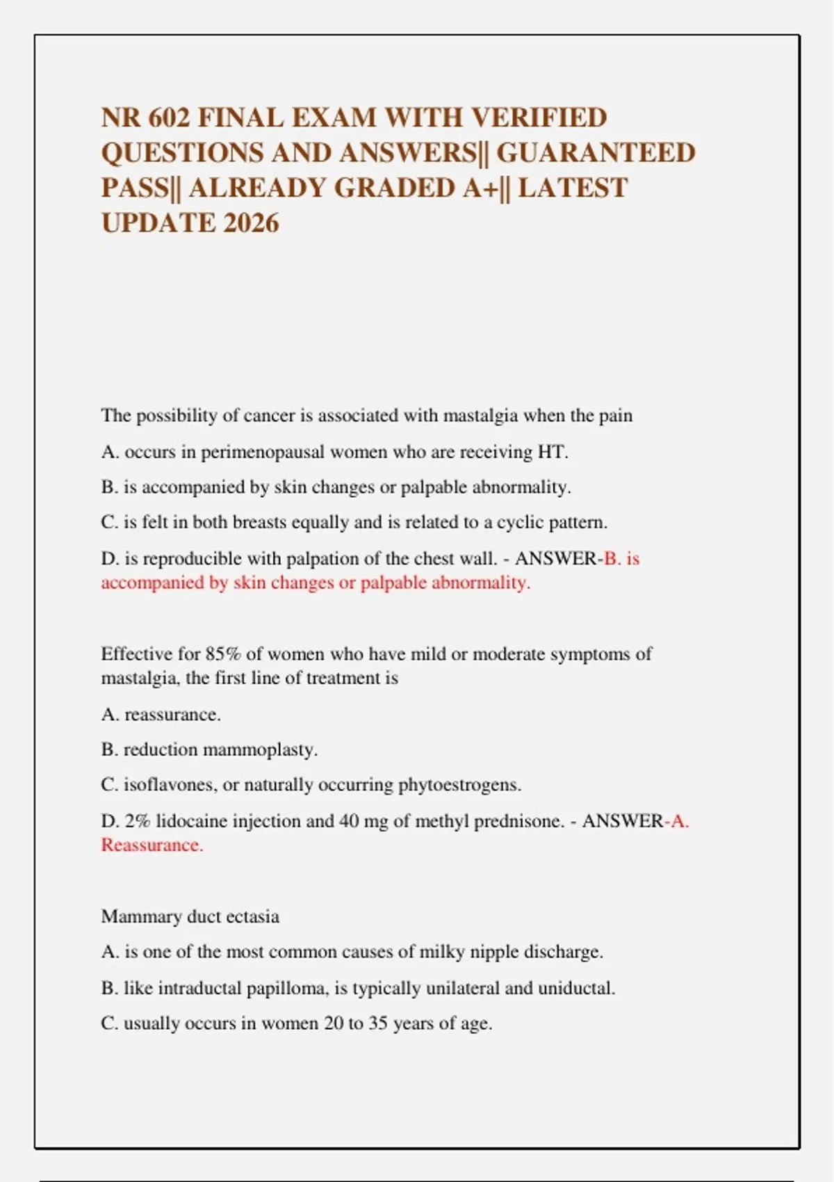 NR 602 FINAL EXAM WITH VERIFIED QUESTIONS AND ANSWERS|| GUARANTEED PASS|| ALREADY GRADED A+|| LATEST UPDATE 2026 The possibility of cancer is associated with mastalgia when the pain A. occurs in perimenopausal women who are receiving HT. B. is accompanied by skin changes or palpable abnormality. C. is felt in both breasts equally and is related to a cyclic pattern. D. is reproducible with palpation of the chest wall. - ANSWER-B. is accompanied by skin changes or palpable abnormality. Effective for 85% of women who have mild or moderate symptoms of mastalgia, the first line of treatment is A. reassurance. B. reduction mammoplasty. C. isoflavones, or naturally occurring phytoestrogens. D. 2% lidocaine injection and 40 mg of methyl prednisone. - ANSWER-A. Reassurance. Mammary duct ectasia A. is one of the most common causes of milky nipple discharge. B. like intraductal papilloma, is typically unilateral and uniductal. C. usually occurs in women 20 to 35 years of age. D. discharge may be green, brown, or black in color. - ANSWER-D. discharge may be green, brown, or black in color. If a woman is complaining of bilateral, milky nipple discharge, the clinician is to first A. perform a pregnancy test. B. perform a mammogram and an ultrasound of the breasts. C. assess the sella turcica with magnetic resonance imaging (MRI). D. obtain a serum prolactin level and a thyroid-stimulating hormone (TSH) measurement. - ANSWER-A. perform a pregnancy test. The most common benign breast masses are A. galactoceles. B. hamartomas. C. fibroadenomas and cysts. D. lipomas and phyllodestumors. - ANSWER-C. fibroadenomas and cysts. Which breast tissue sampling procedure is best to use when density or calcification is seen on a mammogram in a location that cannot be effectively assessed with a core biopsy? A. Fine-needle aspiration B. MRI-guided needle biopsy C. Needle-localized breast biopsy D. Excisional breast biopsy - ANSWER-C. Needle-localized breast biopsy A major contributor to pelvic stability is A. the coccyx. B the pubis. C the ilium and its ligaments. D the sacrum. - ANSWER-C. the ilium and ligaments The sheet made up of dense fibrous tissue that spans the opening of the anterior pelvic outlet is/are the A. sphinter muscles. B. deep perineal space. C. perineal membrane. D. distal vagina. - ANSWER-A. Sphincter muscles