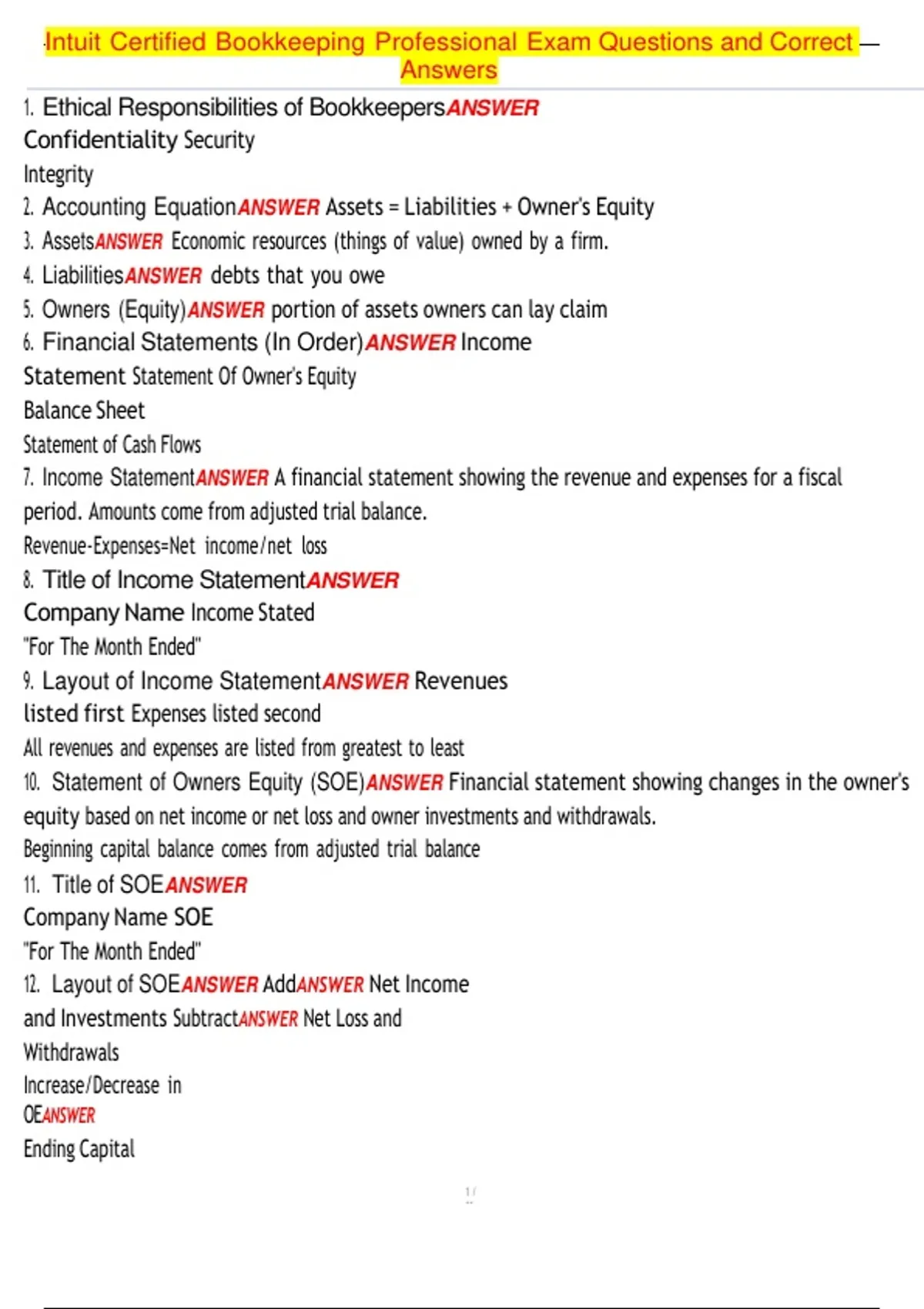 , Intuit Certified Bookkeeping Professional Exam Questions and Correct