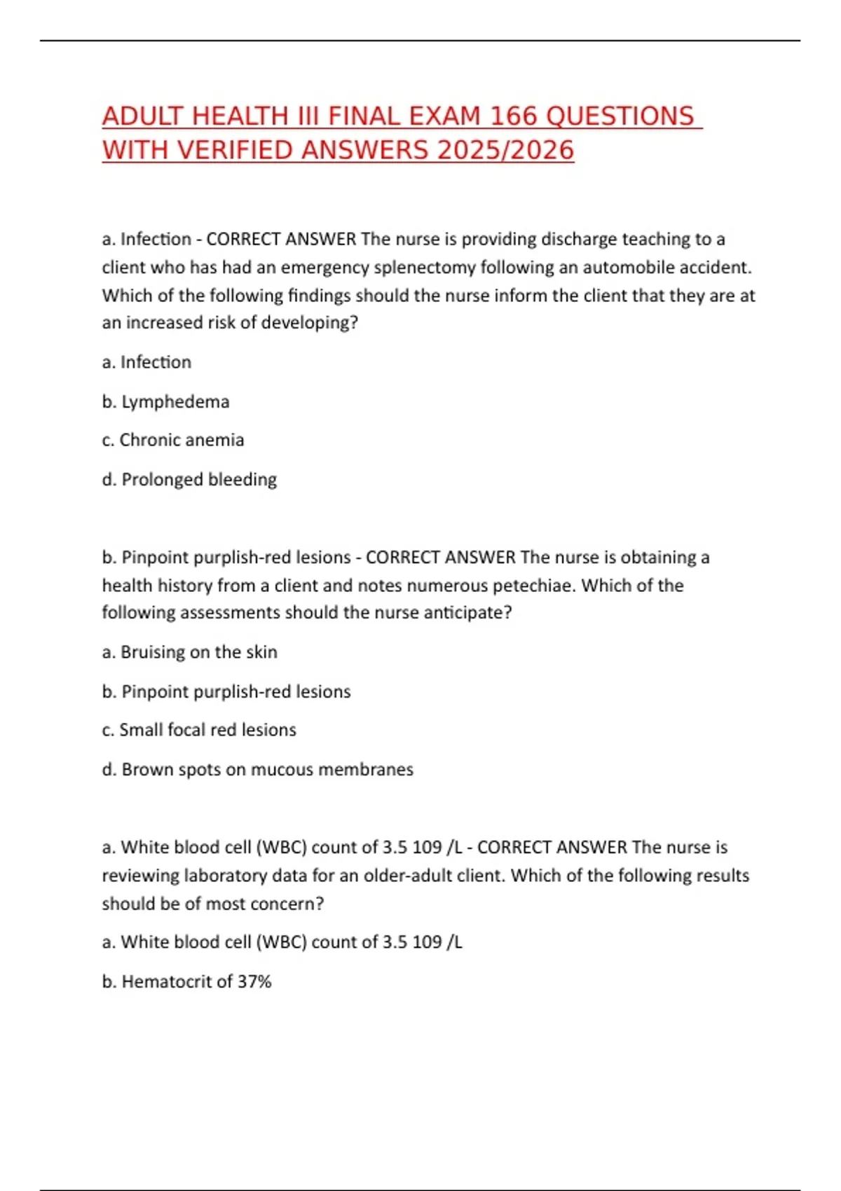 b. Pinpoint purplish-red lesions - CORRECT ANSWER The nurse is obtaining a