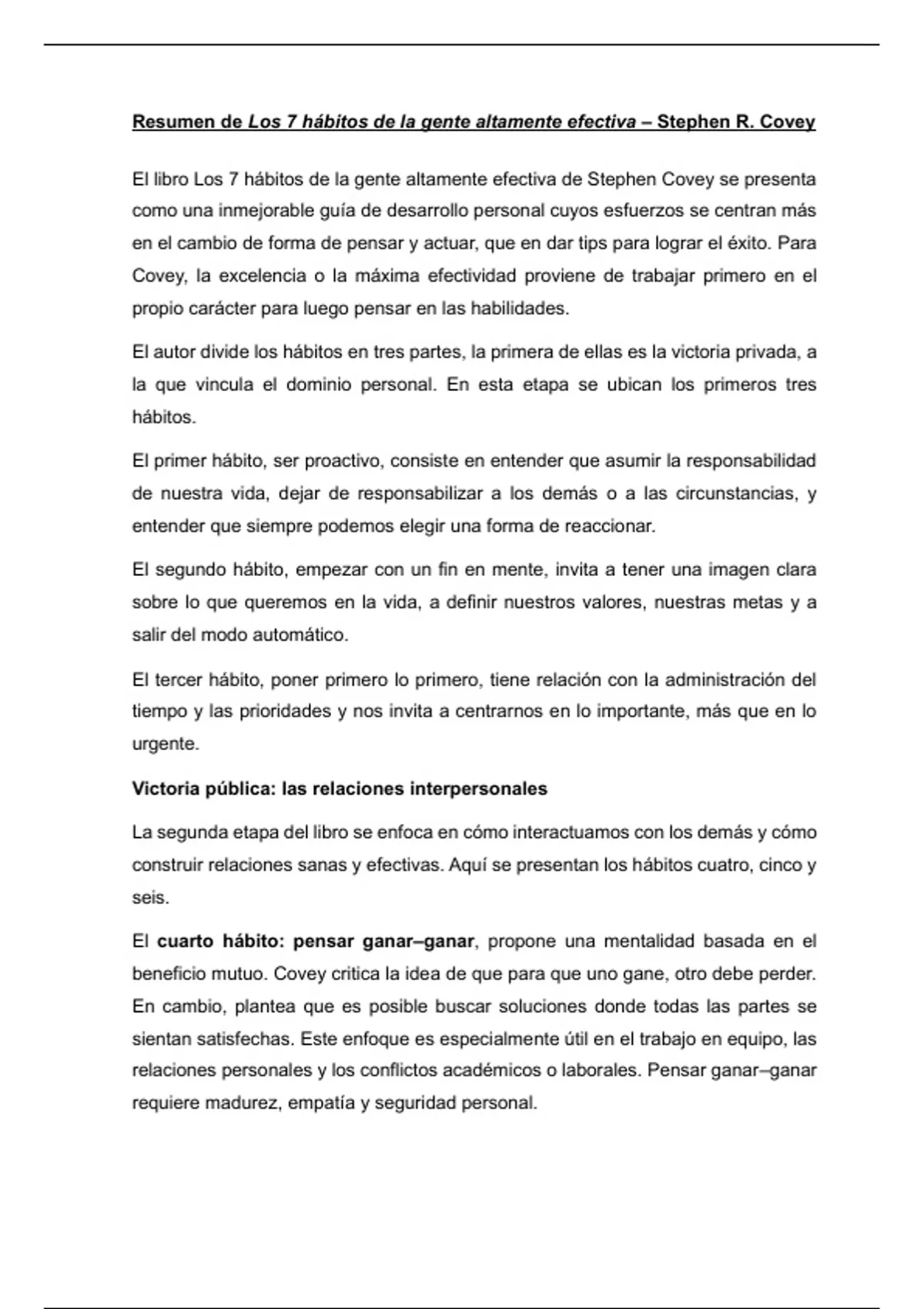 El autor divide los hábitos en tres partes, la primera de ellas es la victoria privada, a