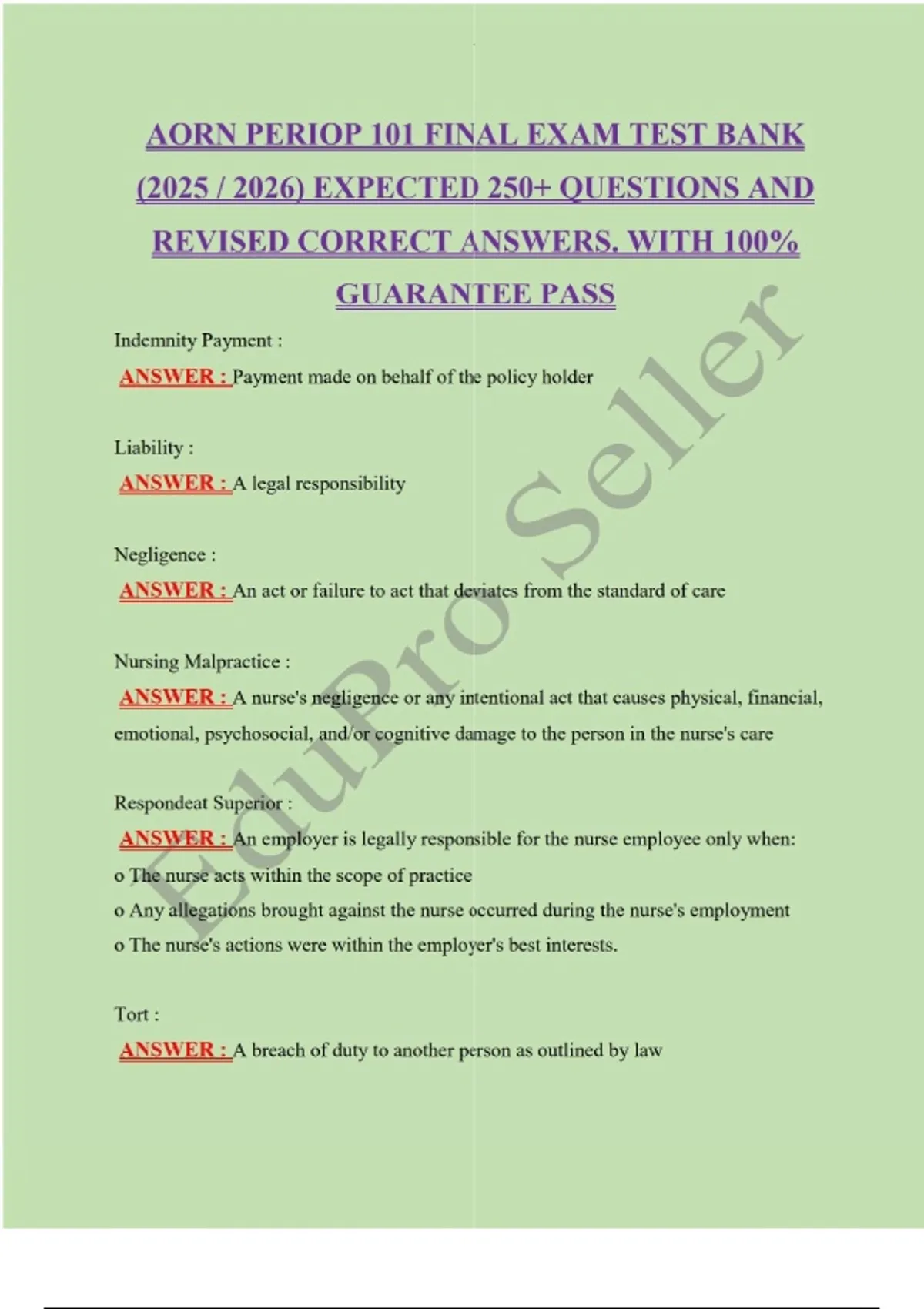 AORN PERIOP 101 FINAL EXAM TEST BANK (2025 / 2026) EXPECTED 250+ QUESTIONS AND REVISED CORRECT ANSWERS. WITH 100% GUARANTEE PASS