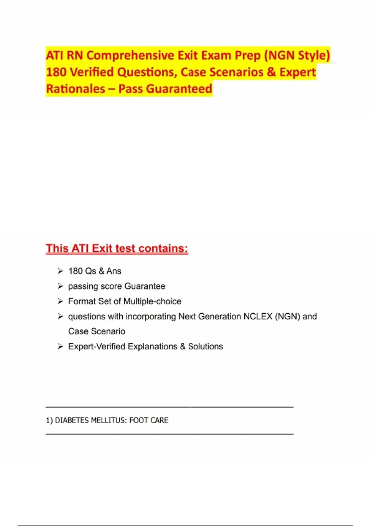 ATI RN Comprehensive Exit Exam Prep (NGN Style) 180 Verified Questions, Case Scenarios & Expert Rationales – Pass GuaranteedPrepare with confidence for your ATI RN Comprehensive Exit Exam using this Next Generation NCLEX (NGN) style resource, designed to mirror the actual exam format and guarantee success. This prep set includes 180 verified multiple‑choice questions (MCQs), case scenarios, and expert‑verified rationales to ensure you’re ready to pass on the first attempt. Features: - 180 Actual Questions & Answers with verified solutions - 100% Pass Guarantee for exam readiness - NGN‑Style Case Scenarios integrated into the question set - Expert‑Verified Rationales explaining correct and incorrect answers - Evidence‑Based Content aligned with ATI and NCLEX standards - Accessible Format for flexible study anytime, anywhere Sample Topics Covered: - Diabetes Mellitus: Foot care and prevention of complications - Nutrition & Dysphagia: Safe feeding techniques and positioning - Renal Disorders: Acute glomerulonephritis hallmark findings - Infectious Diseases: Lyme disease reporting requirements - Liver Disorders: Cirrhosis case management (orientation checks, sodium restriction, skin care) - Ethics: Beneficence in nursing practice - Child Safety: Mandatory reporting of suspected abuse - HIV Care: Tertiary prevention strategies (medication adherence reminders) This resource is ideal for nursing students preparing for ATI RN Comprehensive Exit Exams who want structured, NGN‑style practice with rationales that build confidence and exam readiness