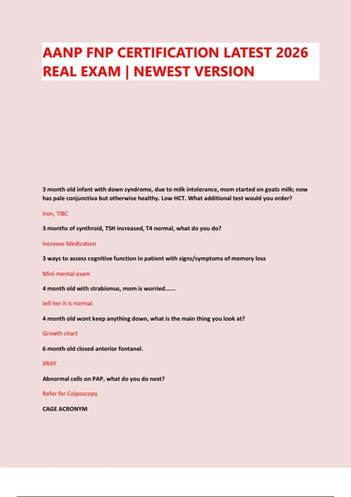 Prepare to pass your AANP Family Nurse Practitioner certification exam on the first try with this latest 2026 test bank, featuring 200+ actual exam-style questions with detailed, verified answers. This comprehensive resource is meticulously curated to reflect the newest exam format and content areas, including: Pediatrics & Newborn Care Adult & Geriatric Health Pharmacology & Treatment Guidelines Diagnostic Testing & Interpretation Acute & Chronic Disease Management Women’s Health & OB/GYN Mental Health & Behavioral Conditions Dermatology, Cardiology, Endocrine, and More Each question is designed to test your clinical reasoning, reinforce key concepts, and simulate the real exam experience. Whether you’re a recent graduate or an experienced nurse advancing your career, this test bank will build your confidence, identify knowledge gaps, and ensure you’re fully prepared for exam day. Perfect for: AANP FNP certification candidates Nurse practitioners preparing for boards FNP students in final review Healthcare professionals seeking certification renewal