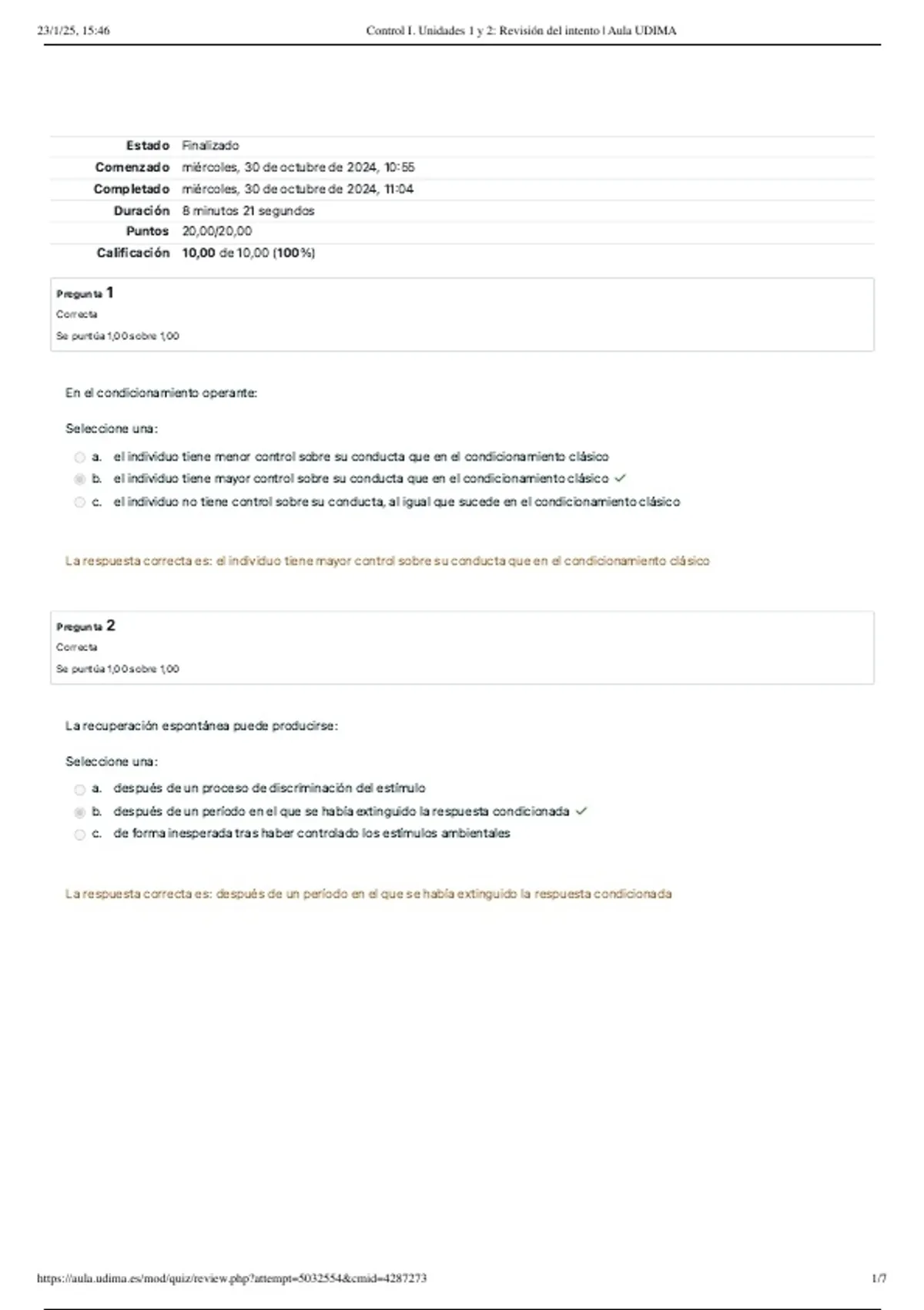 Se incluyen todos los controles resueltos de la asignatura Psicología del Aprendizaje de UDIMA con calificación de sobresaliente.