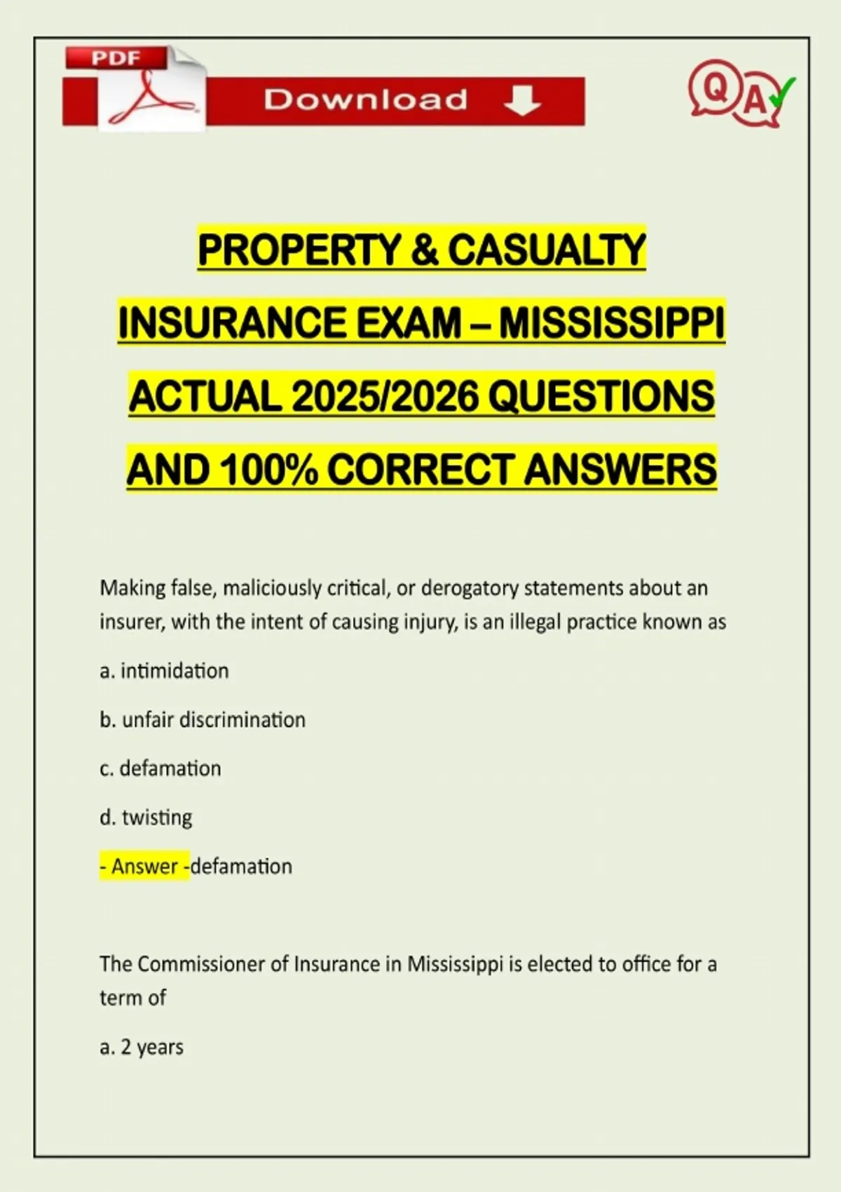 PROPERTY & CASUALTY INSURANCE EXAM – MISSISSIPPI ACTUAL 2025/2026 QUESTIONS AND 100% CORRECT ANSWERS Making false, maliciously critical, or derogatory statements about an insurer, with the intent of causing injury, is an illegal practice known as a. intimidation b. unfair discrimination c. defamation d. twisting - Answer -defamation The Commissioner of Insurance in Mississippi is elected to office for a term of a. 2 yearsNeed assistance on Online classes, Exams & Assignments? Reach out for instant help!! Full Course Assistance, Plagiarism-free Essay Writing, Research Paper, Dissertation, Discussion Posts, etc…. Confidential & Secure services. Tutors are available for all subjects! Email now at: b. 4 years c. 6 years d. 8 years - Answer -4 years All of the following are true about temporary producer licenses issued by the Commissioner EXCEPT a. temporary licenses are issued for a limited term b. a temporary license may be issued to another person upon the death of a licensed ag