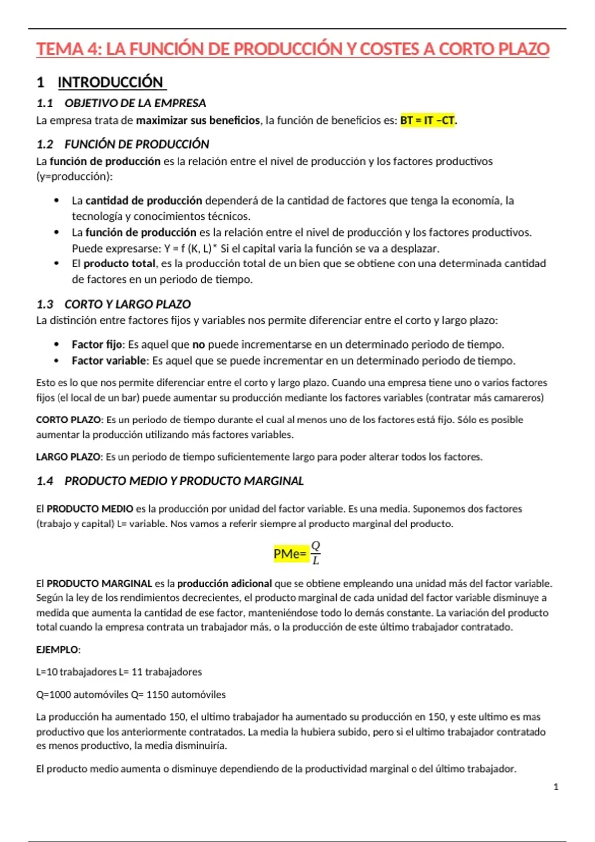 TEMA 4: LA FUNCIÓN DE PRODUCCIÓN Y COSTES A CORTO PLAZO