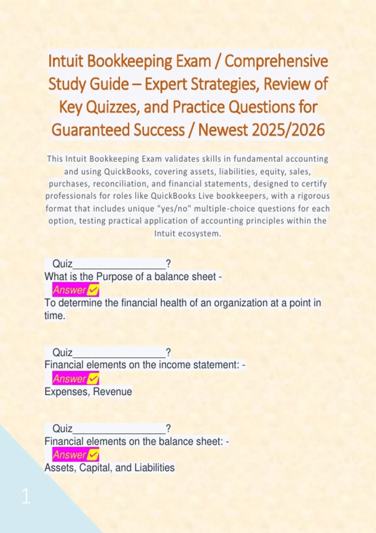 Intuit Bookkeeping Exam / Comprehensive Study Guide – Expert Strategies, Review of Key Quizzes, and Practice Questions for Guaranteed Success / Newest 2025/2026 This Intuit Bookkeeping Exam validates skills in fundamental accounting and using QuickBooks, covering assets, liabilities, equity, sales, purchases, reconciliation, and financial statements, designed to certify professionals for roles like QuickBooks Live bookkeepers, with a rigorous format that includes unique "yes/no" multiple-choice questions for each option, testing practical application of accounting principles within the Intuit ecosystem.