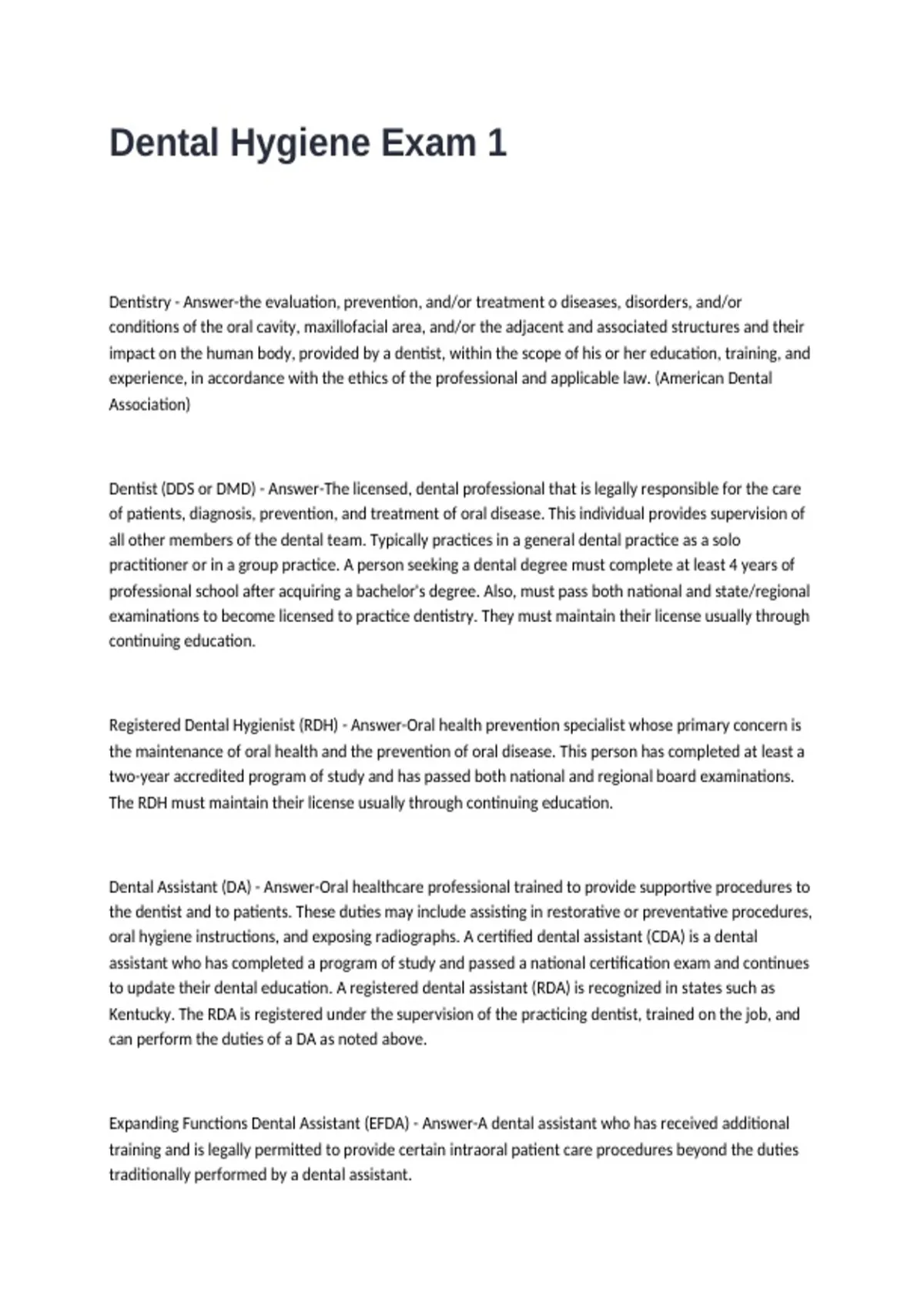 Registered Dental Hygienist (RDH) - Answer-Oral health prevention specialist whose primary concern is