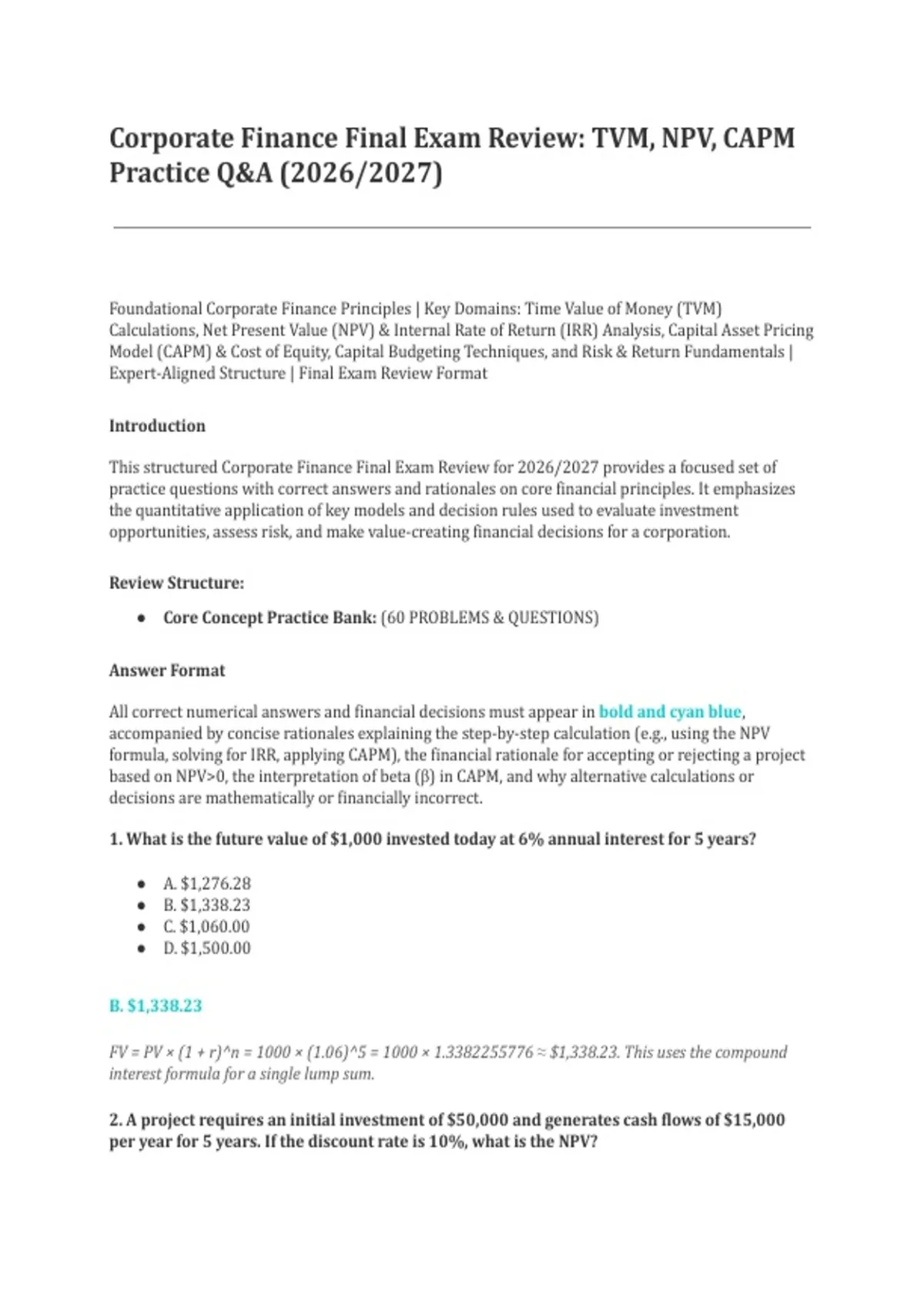 This structured Corporate Finance Final Exam Review for 2026/2027 provides a focused set of