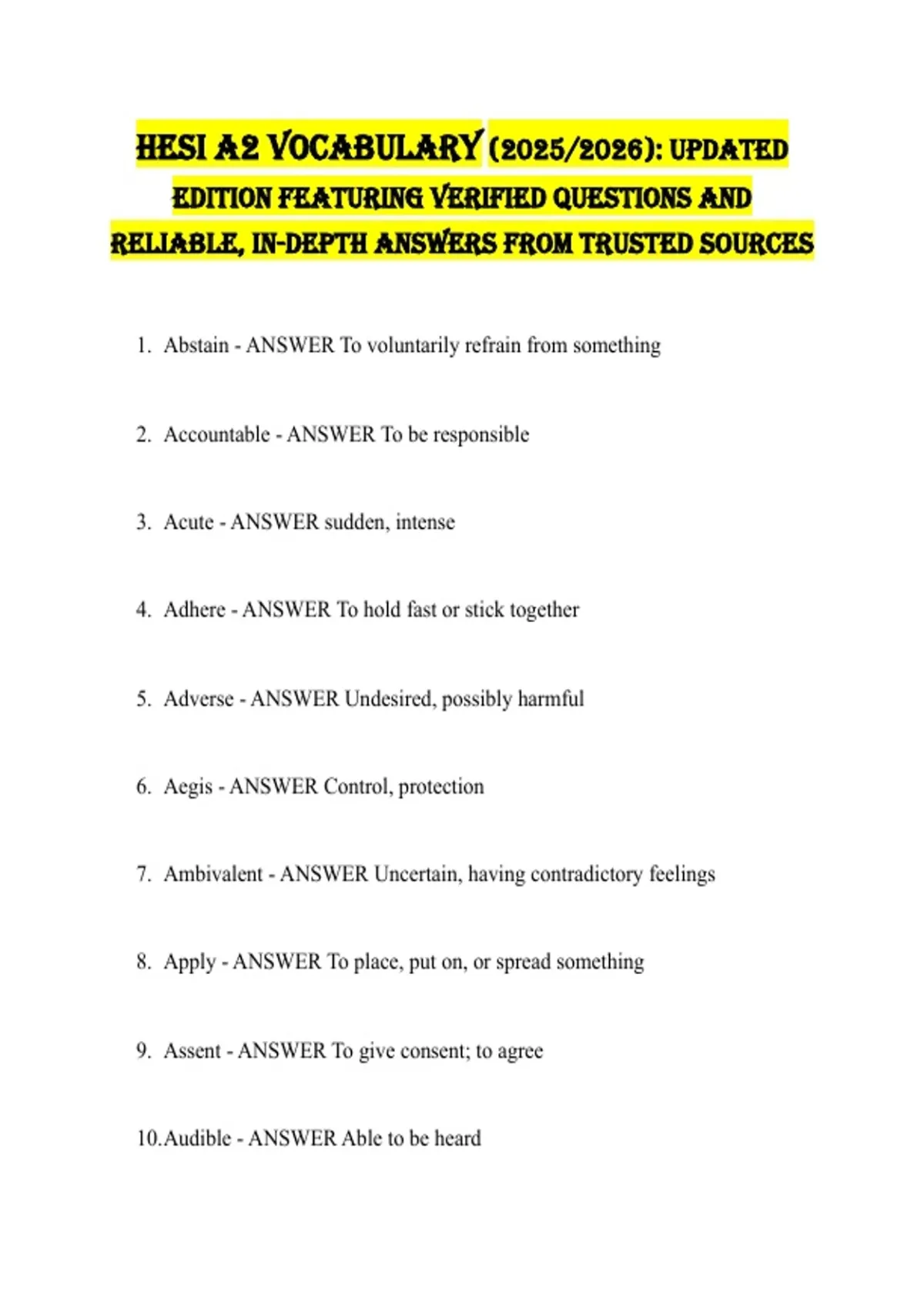 HESI A2 Vocabulary (2025/2026): Updated Edition Featuring Verified Questions and Reliable, In-Depth Answers from Trusted Sources 1. Abstain - ANSWER To voluntarily refrain from something 2. Accountable - ANSWER To be responsible 3. Acute - ANSWER sudden, intense 4. Adhere - ANSWER To hold fast or stick together 5. Adverse - ANSWER Undesired, possibly harmful 6. Aegis - ANSWER Control, protection 7. Ambivalent - ANSWER Uncertain, having contradictory feelings 8. Apply - ANSWER To place, put on, or spread something 9. Assent - ANSWER To give consent; to agree 10. Audible - ANSWER Able to be heard 11. Bacteria - ANSWER SIngle-celled, microorganisms 12. Bilateral - ANSWER Present on two sides 13. Cardiac - ANSWER Of or relating to the heart 14. Cavity - ANSWER An opening or an empty area 15. Cease - ANSWER Come to an end or bring to an end 16. Chronology - ANSWER Order of events as they occurred; timeline 17. Compensatory - ANSWER Offsetting or making up for something 18. Concave - ANSWER Rounded inward 19. Concise - ANSWER Brief and to the point 20. Consistency - ANSWER Degree of viscosity; how thick or thin a fluid is in relation to how it flows 21. Constrict - ANSWER To draw together or become smaller 22. Contingent - ANSWER Dependent 23. Contraindication - ANSWER A reason why something is not advisable or why it should not be done 24. Convulsive - ANSWER Having or causing convulsions, i.e., violent shaking of the body 25. Cursory - ANSWER quick, perfunctory, not thorough 26. Defecate - ANSWER Expel feces 27. Deficit - ANSWER A deficiency or lack of something 28. Depress - ANSWER Press downward 29. Depth - ANSWER Downward measurement from a surface Deteriorating - ANSWER Worsening Device - ANSWER Tool or piece of equipment Diagnosis - ANSWER Identification of an injury or disease Dilate - ANSWER to enlarge or expand Dilute - ANSWER To make a liquid less concentrated Discrete - ANSWER Distinct, separate Distal - ANSWER Distant; away from the center (such as of the body) Distended - ANSWER Enlarged or expanded from pressure Dysfunction - ANSWER Impaired or abnormal functioning Empathy - ANSWER Ability to share what others are feeling; understanding the feelings of one another Equilibrium - ANSWER Balance Etiology - ANSWER The origin or cause of a disease or condition Exacerbate - ANSWER To make worse or more severe Expand - ANSWER To increase in size or amount Exposure - ANSWER To come in contact Extension - ANSWER lengthening; unbending a joint
