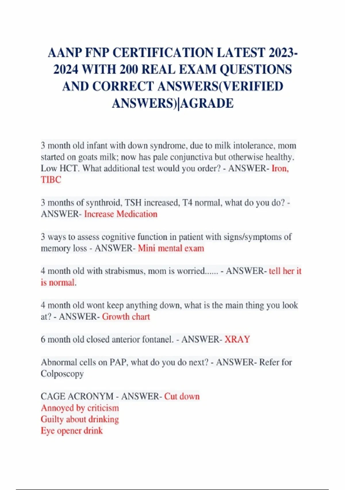 AANP FNP CERTIFICATION LATEST WITH 200 REAL EXAM QUESTIONS AND CORRECT ANSWERS(VERIFIED ANSWERS)|AGRADE 3 month old infant with down syndrome, due to milk intolerance, mom started on goats milk; now has pale conjunctiva but otherwise healthy. Low HCT. What additional test would you order? - ANSWER- Iron, TIBC 3 months of synthroid, TSH increased, T4 normal, what do you do? - ANSWER- Increase Medication