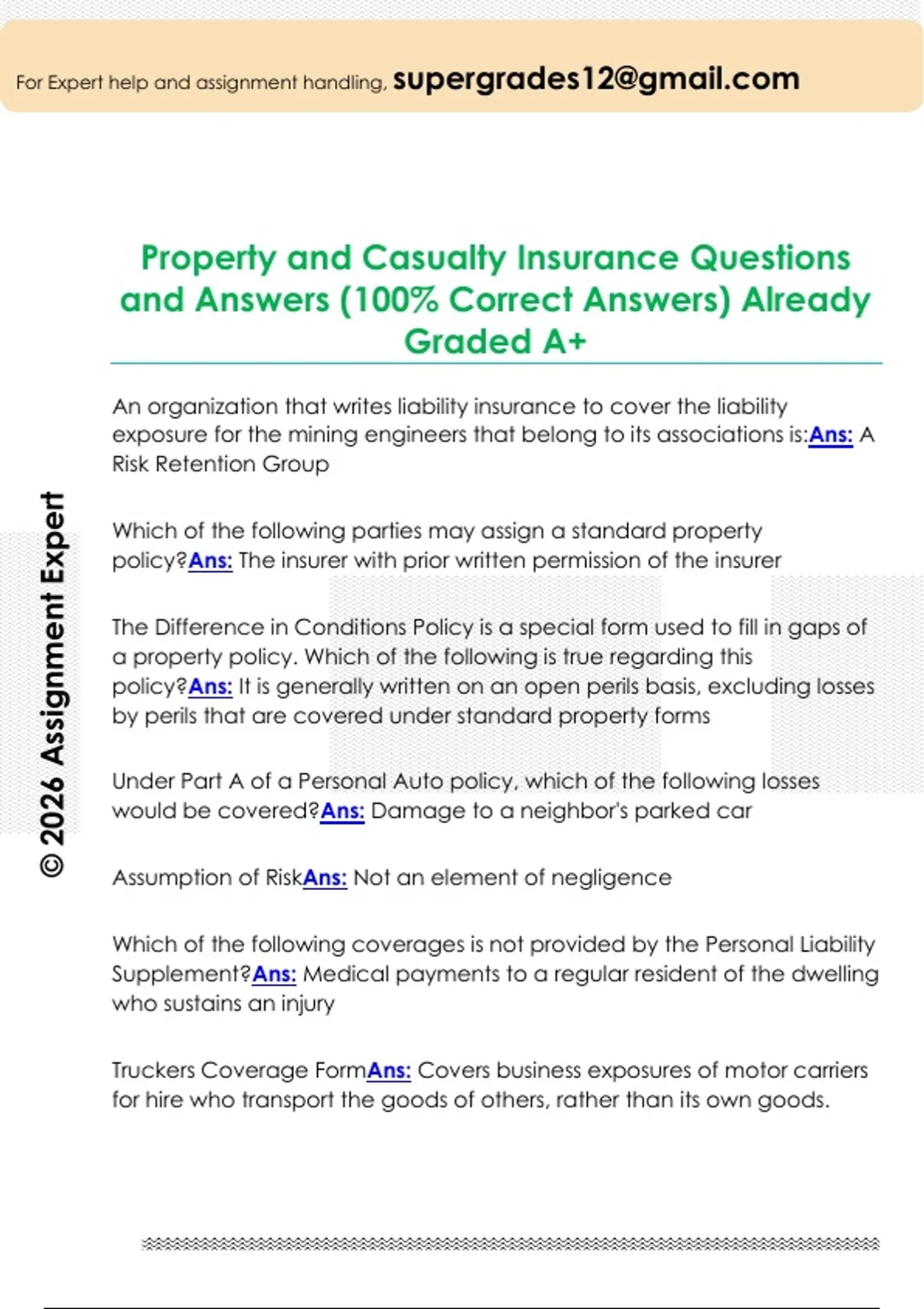 Property and Casualty Insurance Questions and Answers (100% Correct Answers) Already Graded A+